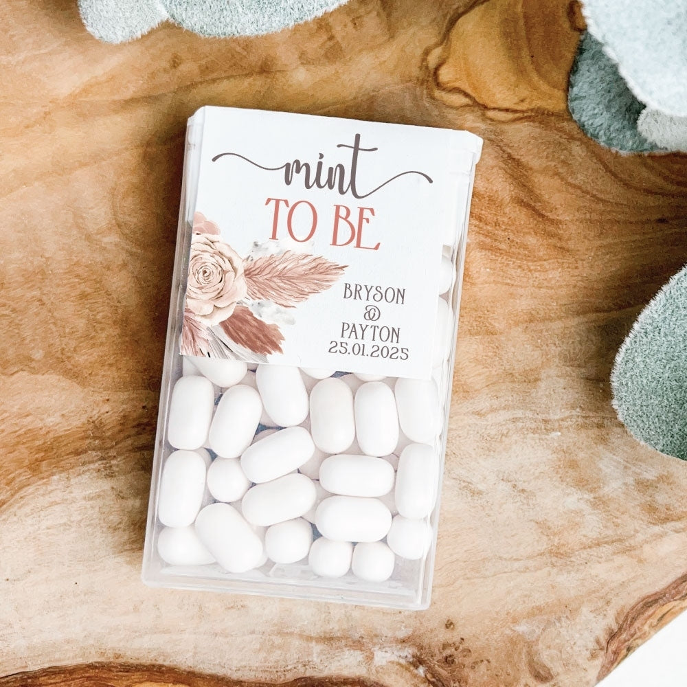 If you prefer a hassle-free experience, you can purchase our pre-made Mint-to-Be Tic Tac favours. These favours come complete with personalized stickers applied to the Tic Tac containers. Simply select your preferred design, provide us with the necessary details like names, date, or message, and we'll take care of the rest. Your favours will arrive ready to be shared with your guests, saving you time and effort.