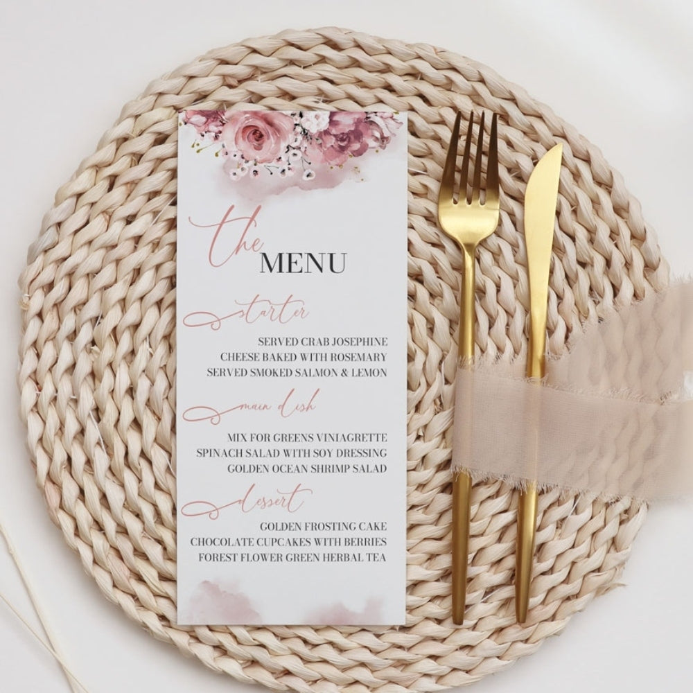 This stationery set exudes timeless elegance with its soft blush pink tones accented by romantic rose motifs and touches of delicate blooms. The addition of gold script lettering and classic black details creates a perfect balance of sophistication and warmth.