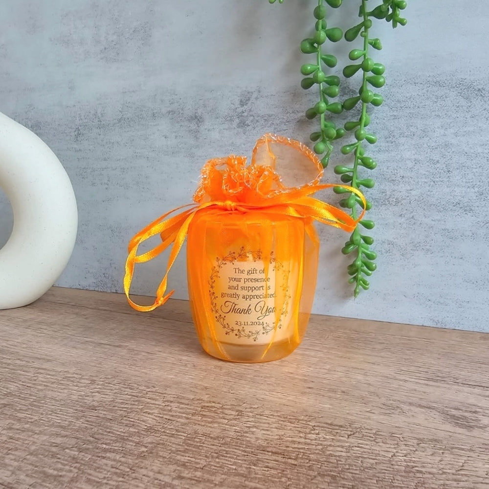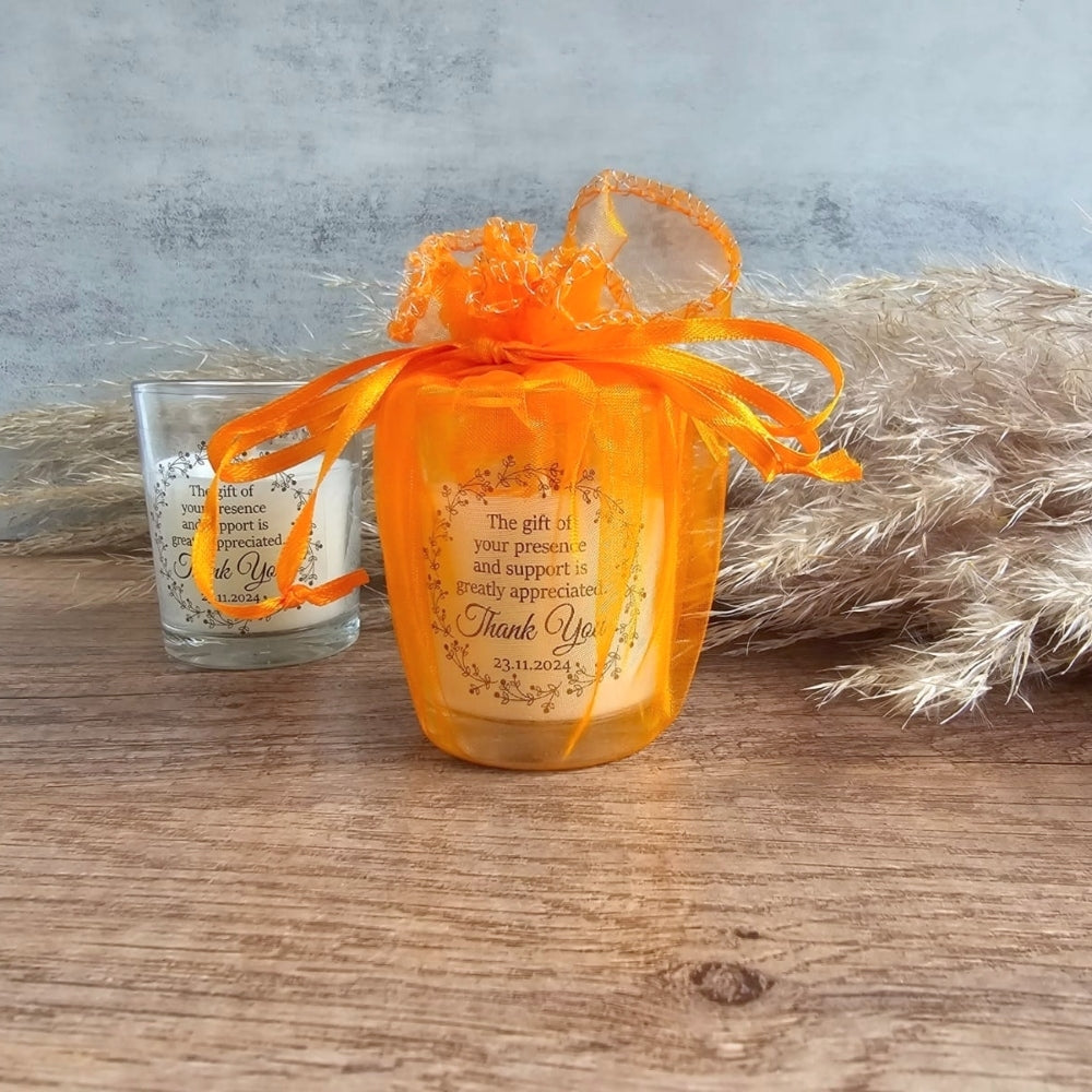 Personalised mini candle votive favours neatly packaged in an organza tulle pouch bag. Bags available in gold, cream and orange.