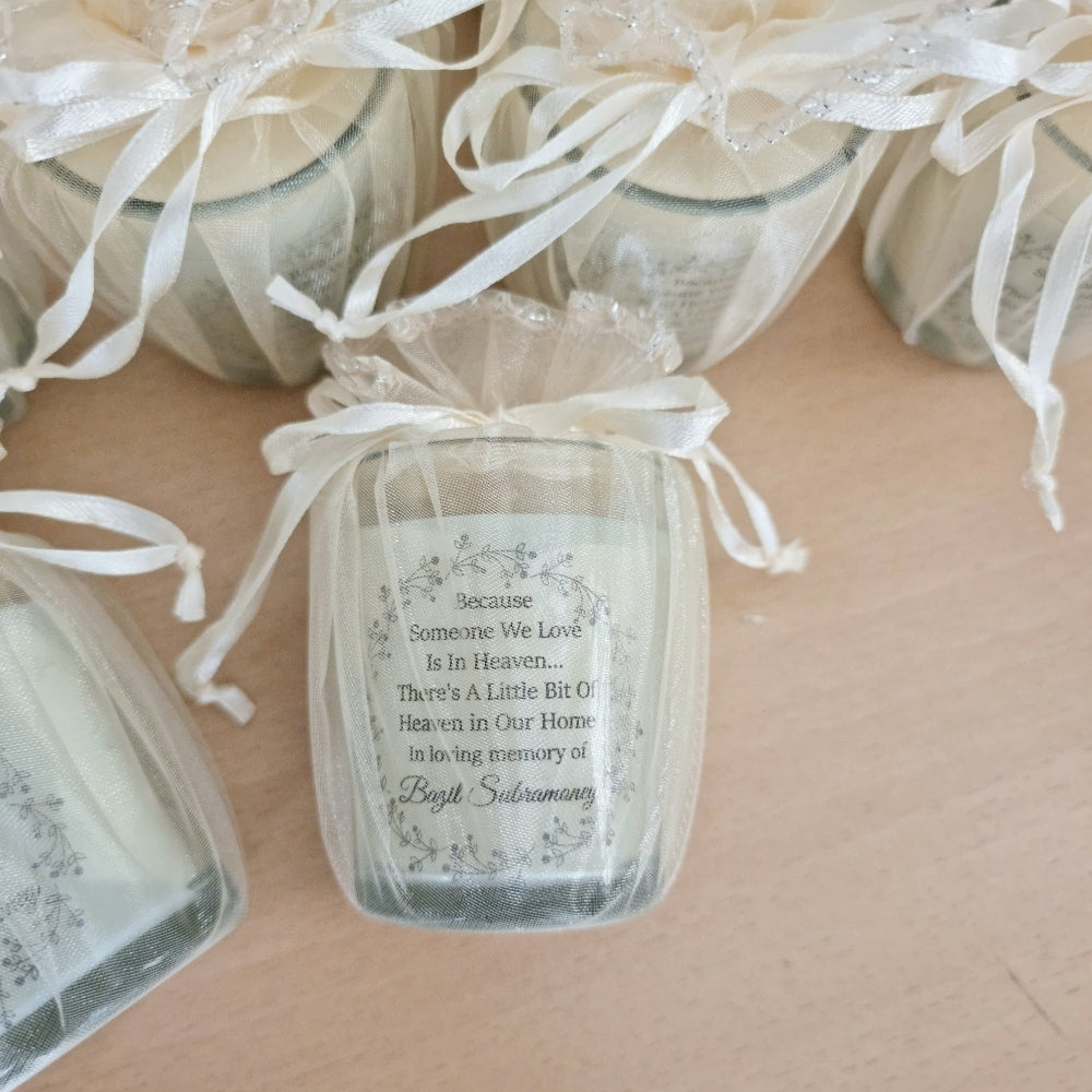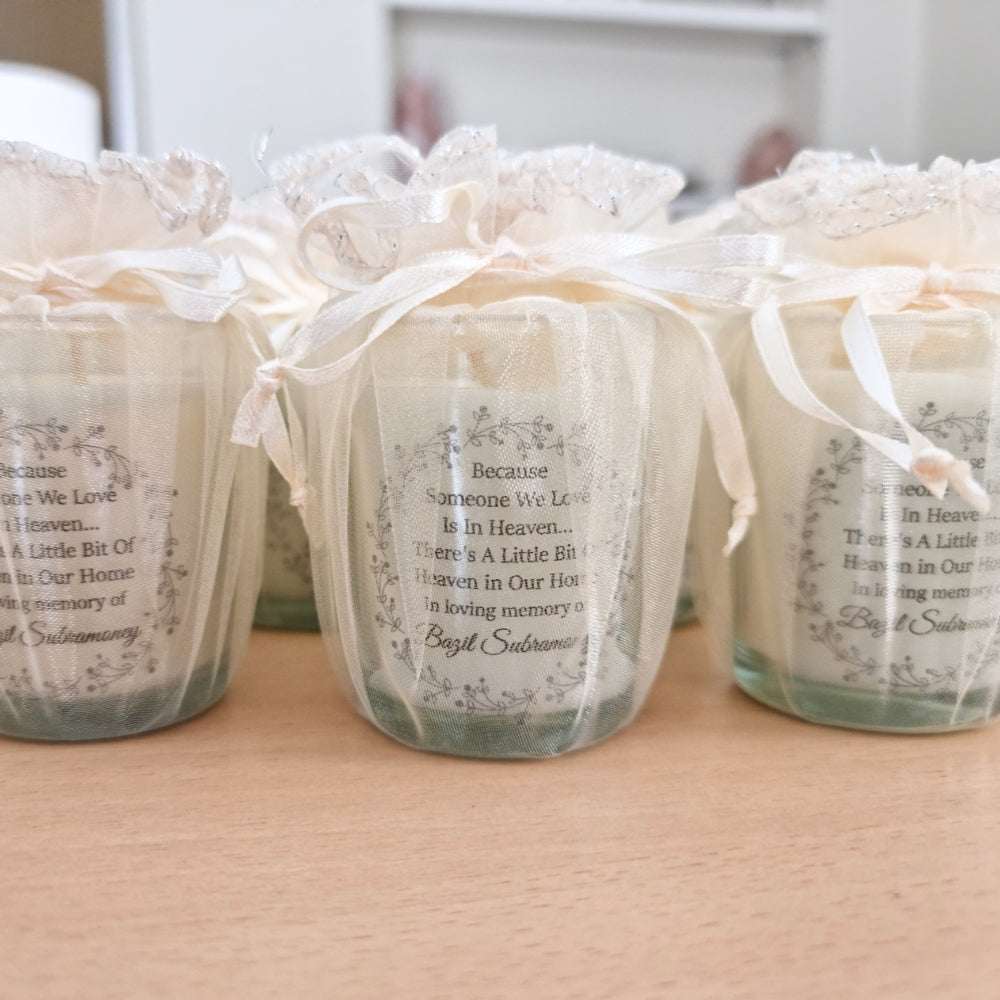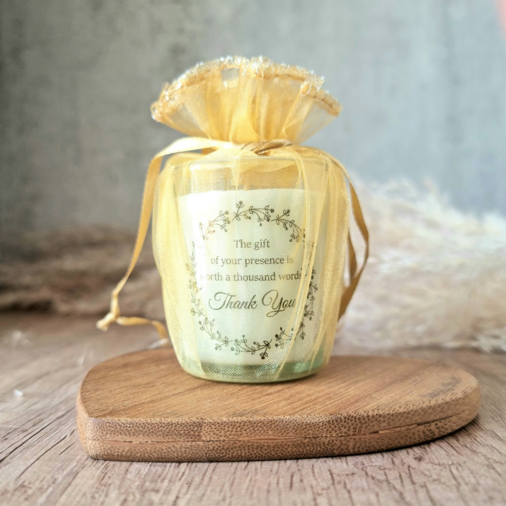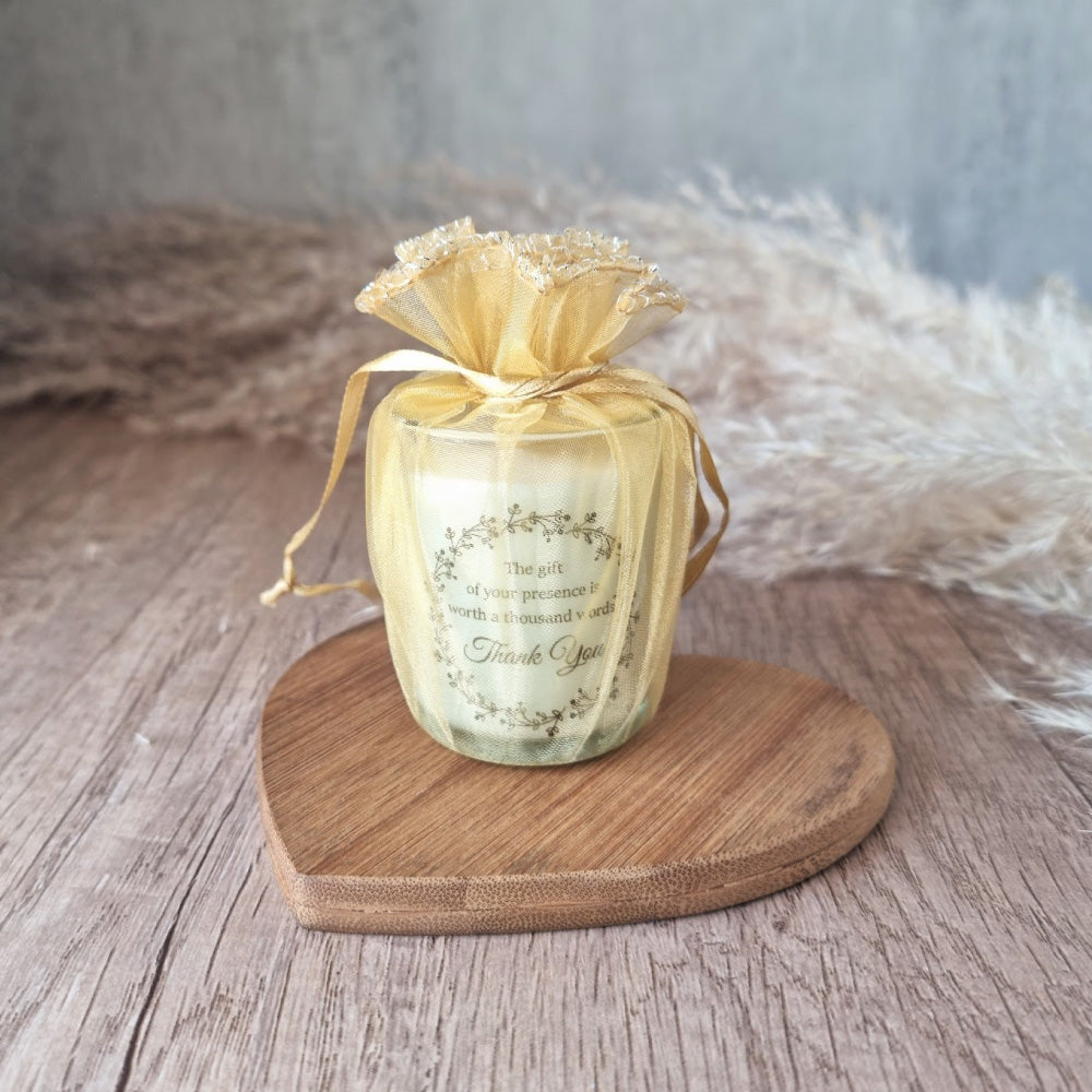 Give your guests a beautiful vanilla scented wax filled votive candle favour as a keepsake and something practical they can use. Includes a personalised sticker to round of your thank you gift.