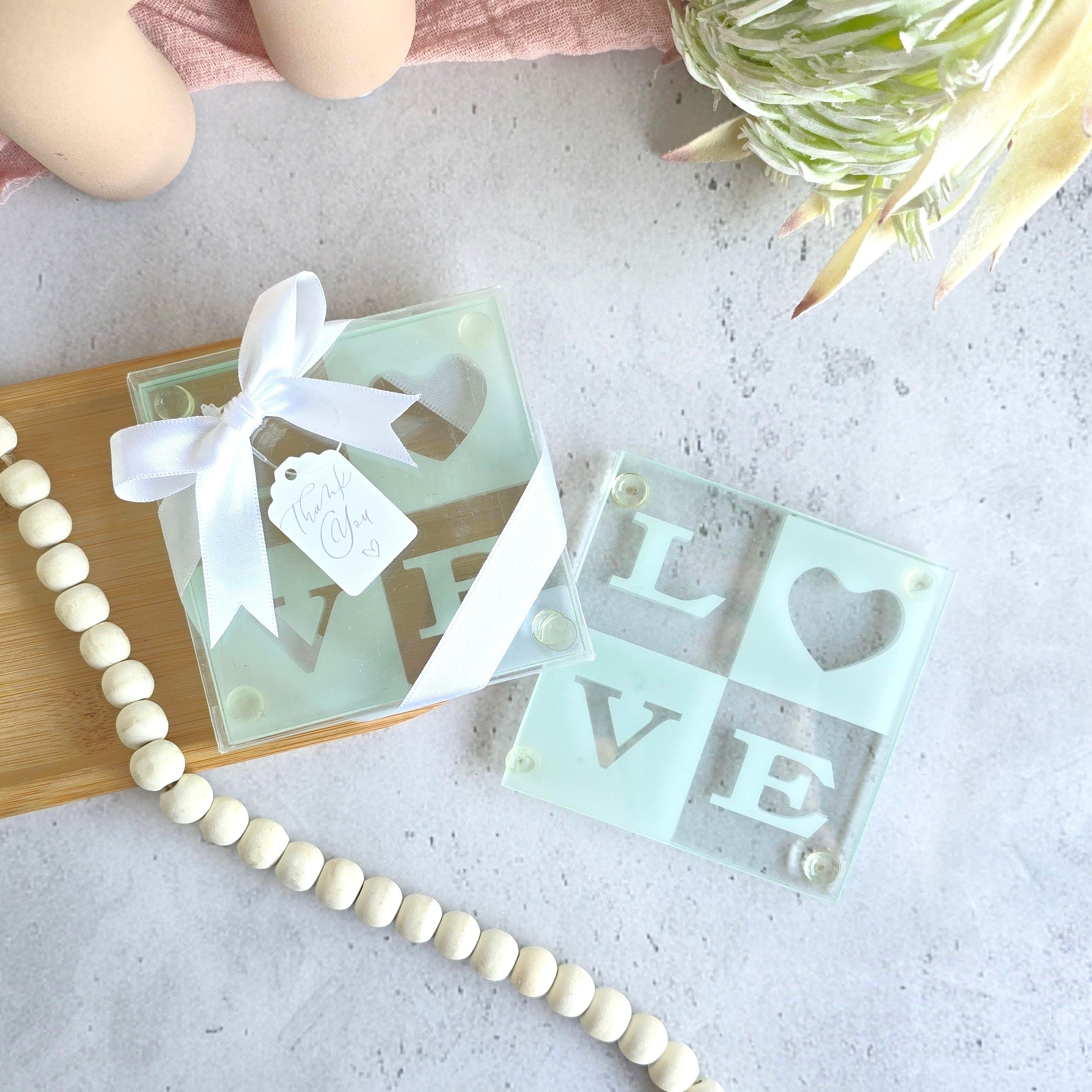 Our L-O-V-E coaster wedding favour spells sophistication. The Love Glass Coaster Gift Set is one of the most popular favour choices for weddings.