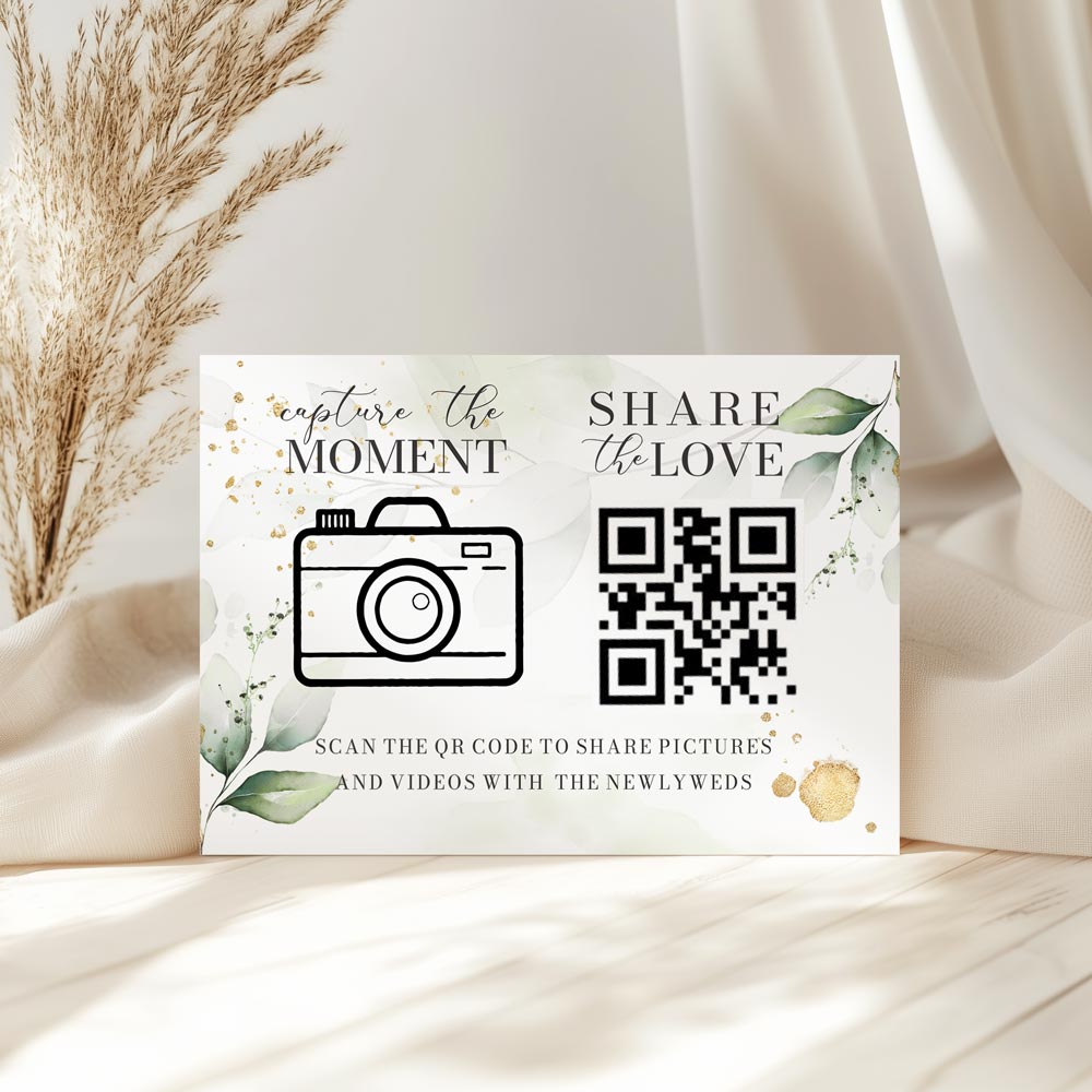 Beautifully crafted with our Elegant Green Botanical design, this sign asks guests to share the photos they capture on their cameras and cell phones, allowing you to see your special day from everyone's perspective.