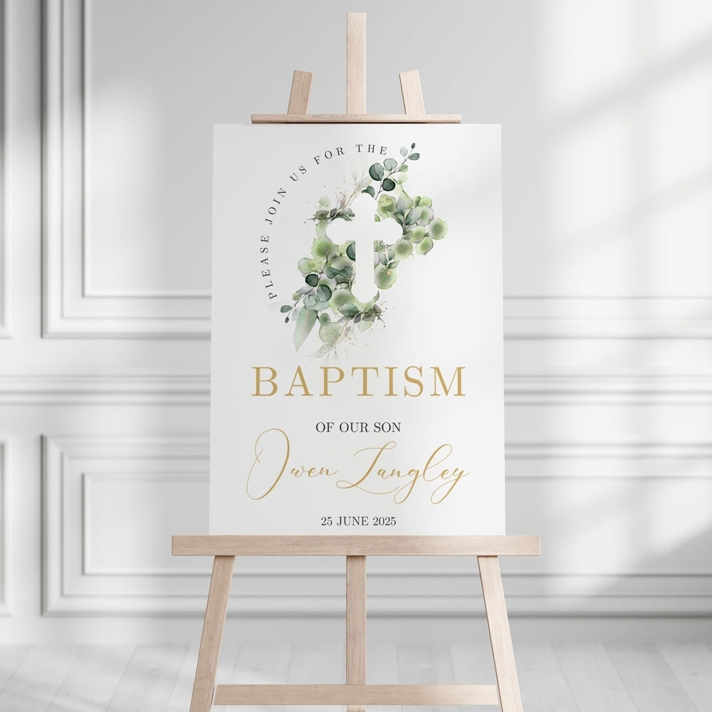 Make a memorable first impression on your guests as they arrive at your baby's Baptism or Christening with this Welcome sign in Elegant Green Botanical design.