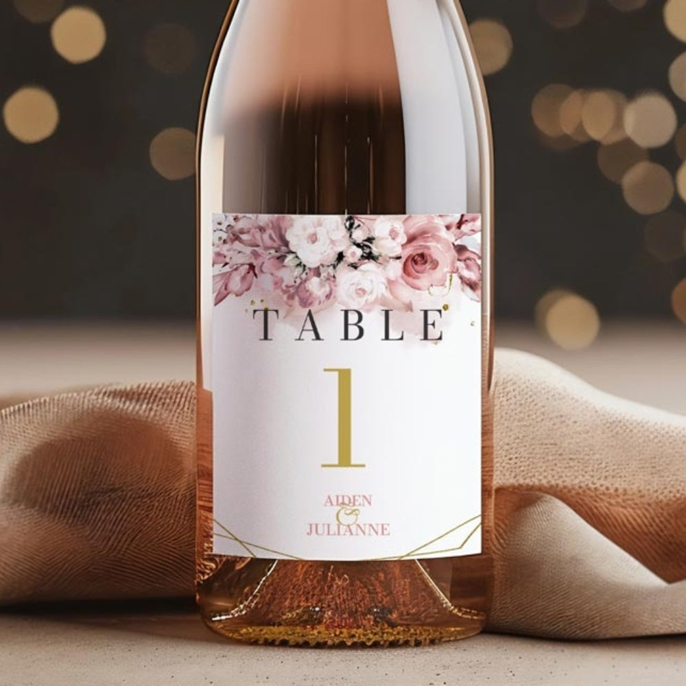 Our Blushing Pink Blooms Wine Label Table Number Stickers are designed to elevate your décor, these dual-purpose stickers effortlessly combine the charm of a wine label with the practicality of a table number.