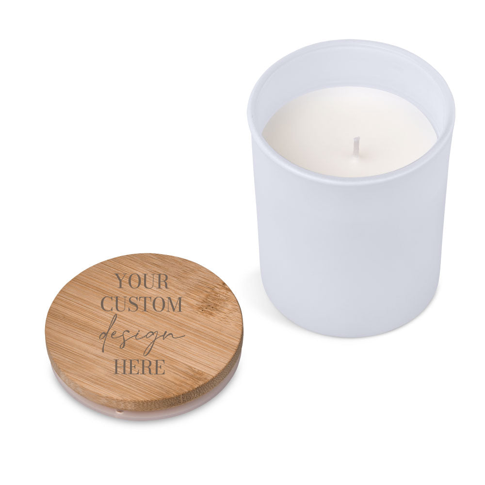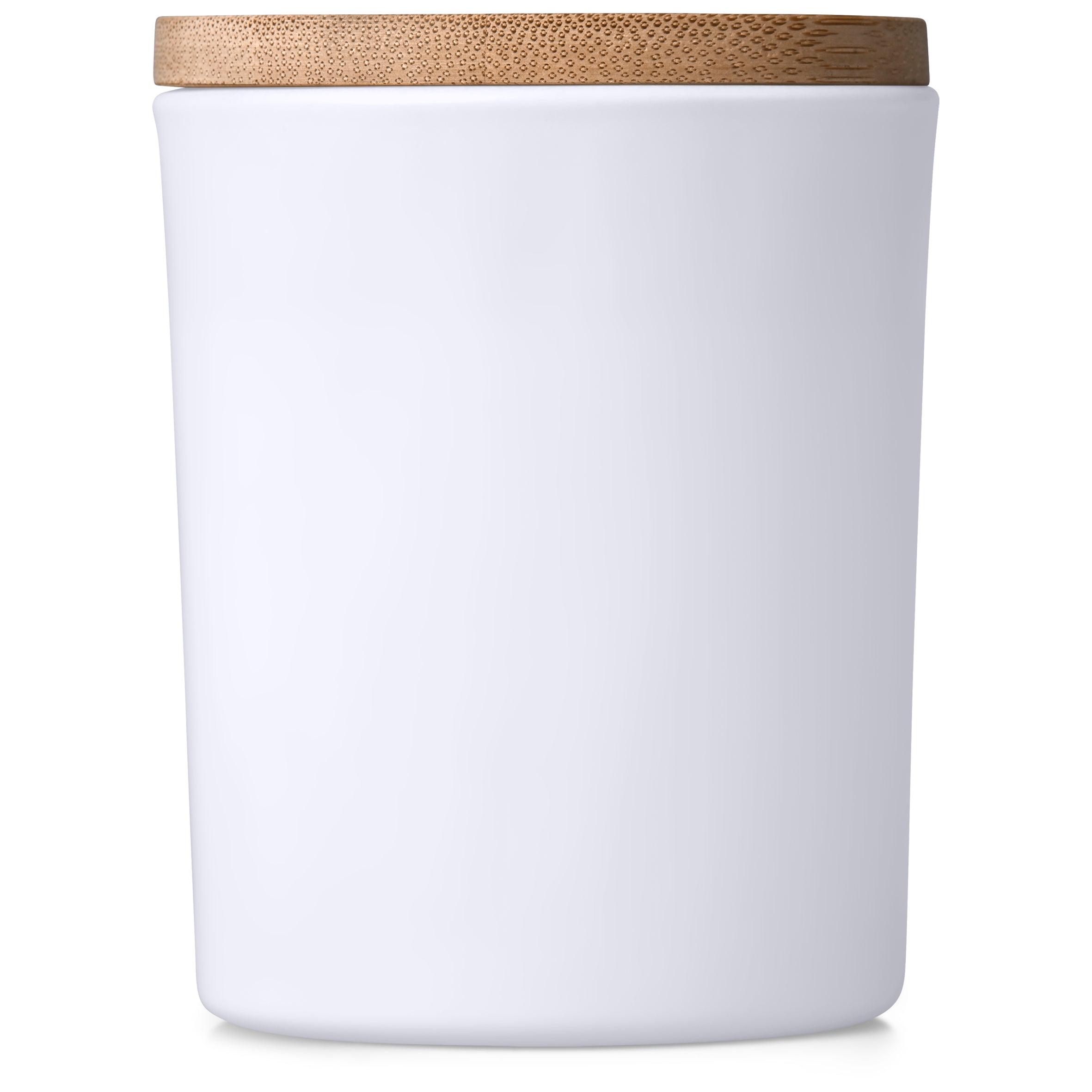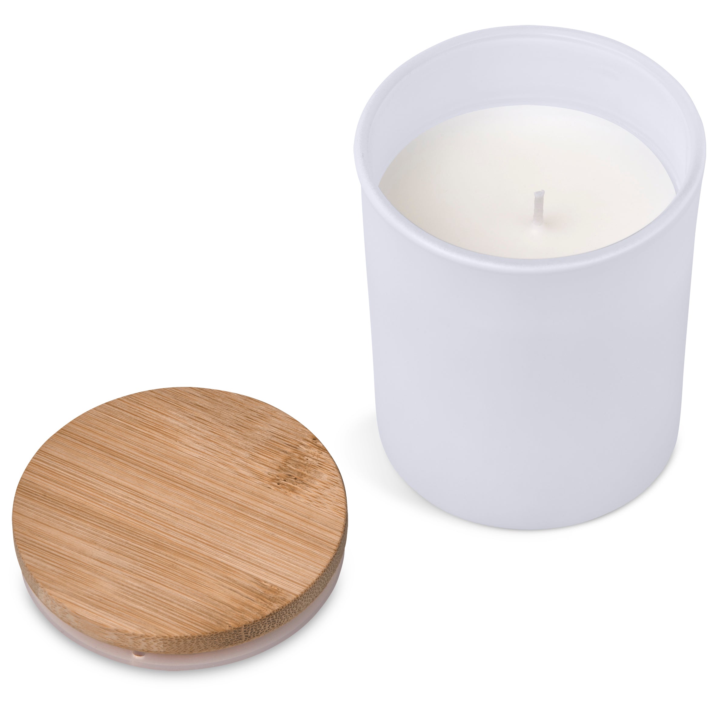 The glass votive candle is presented in a modern elegant frosted glass or white glass jar with a natural bamboo lid, filled with vanilla scented wax.