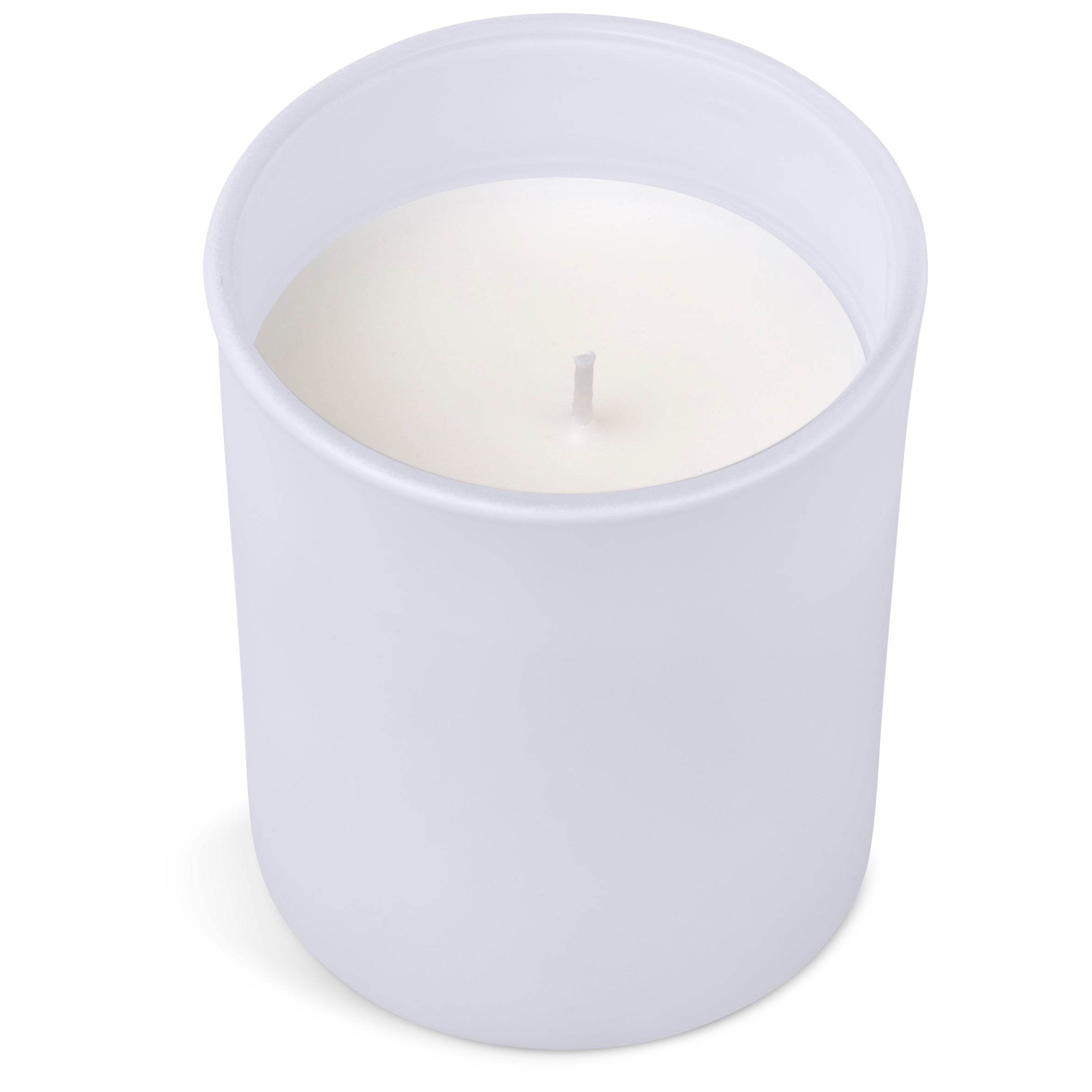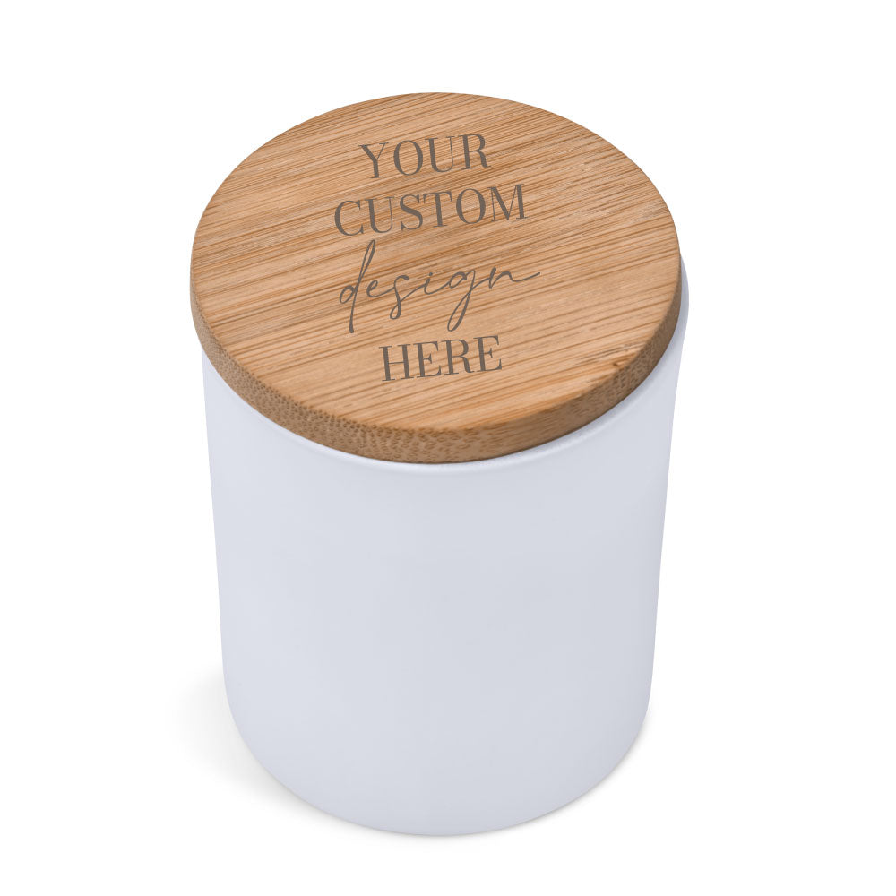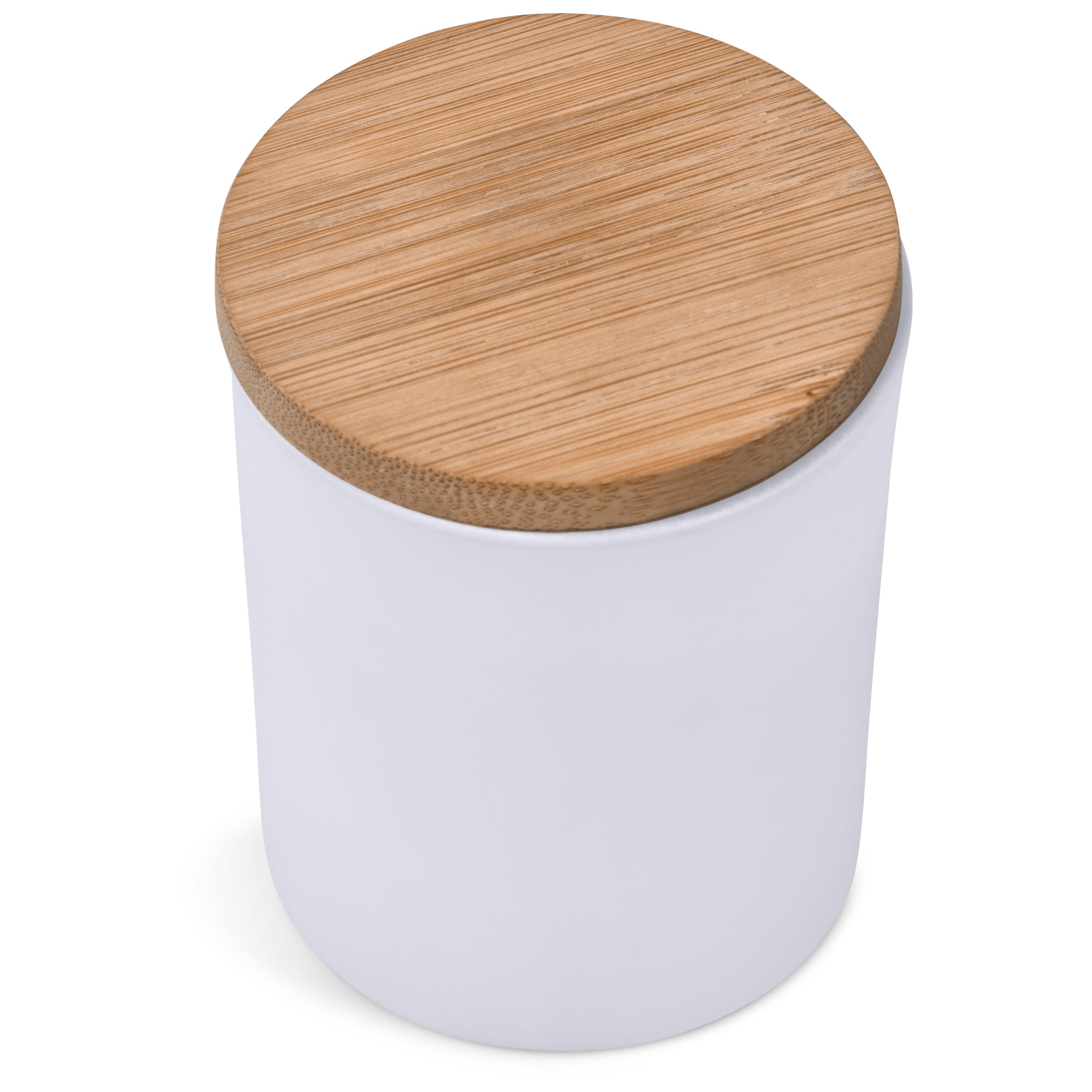 The glass votive candle is presented in a modern elegant frosted glass or white glass jar with a natural bamboo lid, filled with vanilla scented wax.