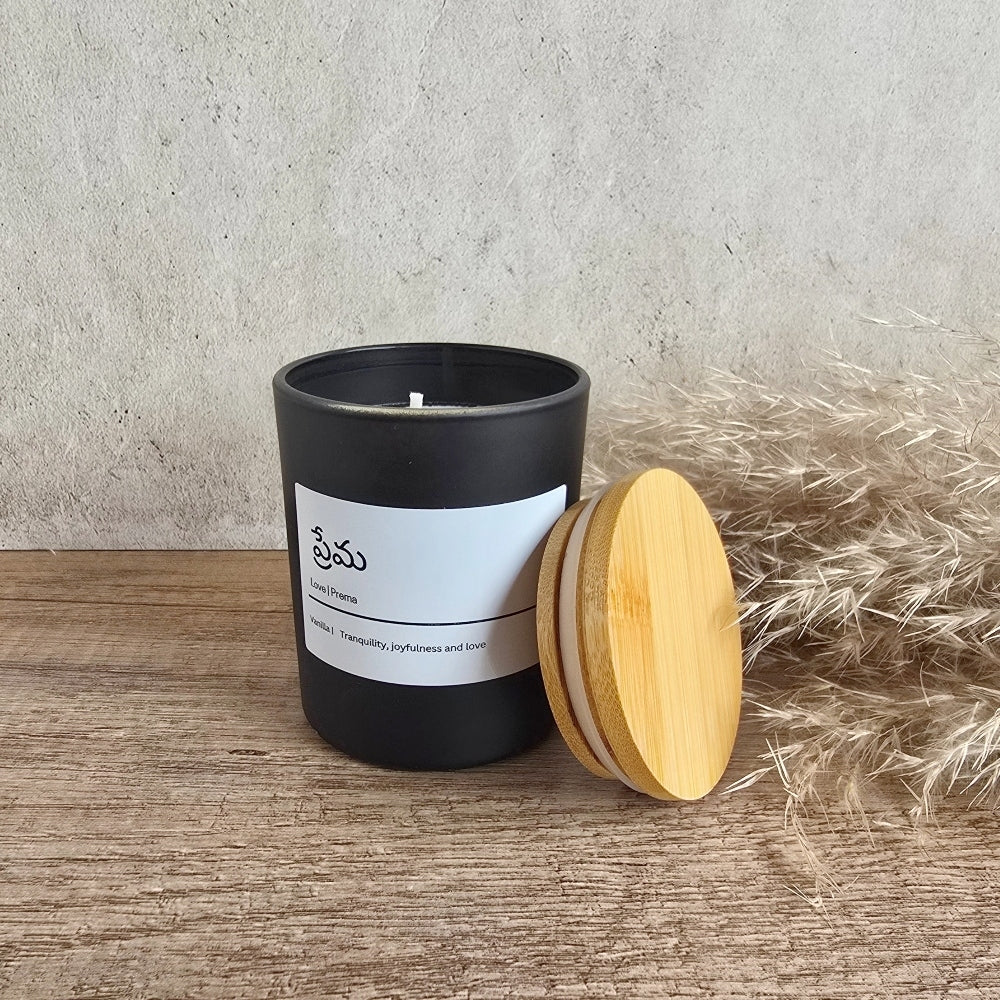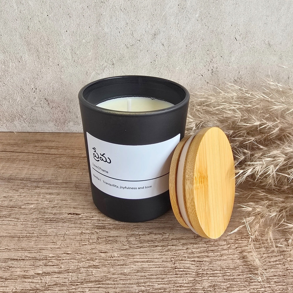 The 375g glass votive candle is presented in a modern elegant black glass votive with a natural bamboo lid, filled with vanilla scented wax.