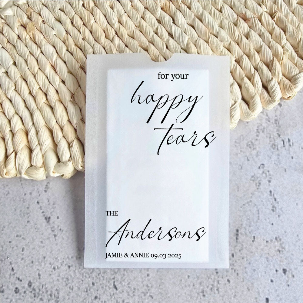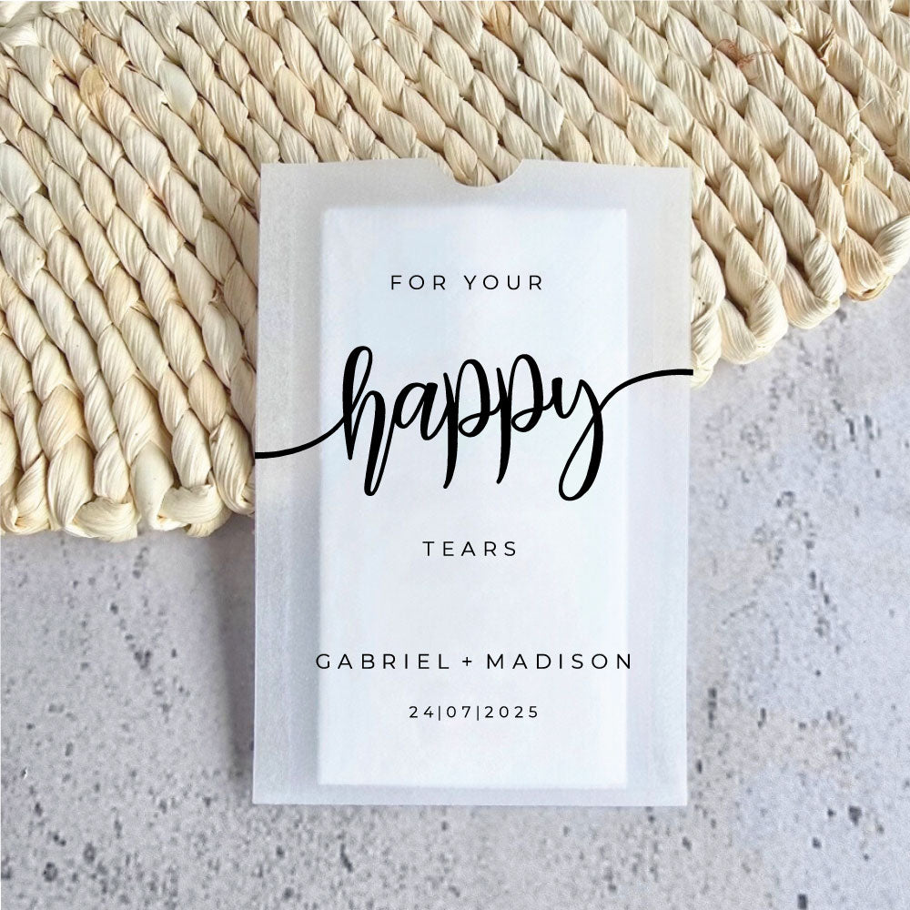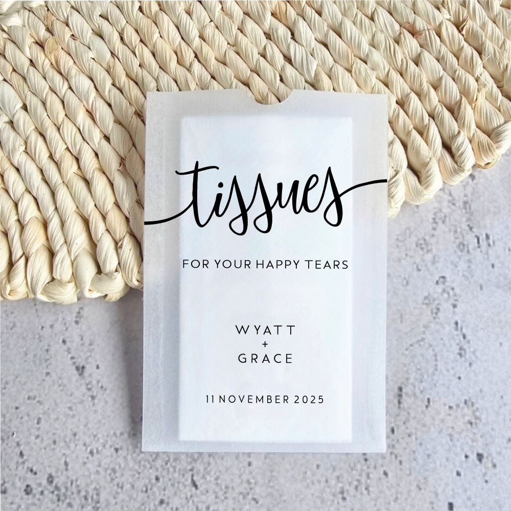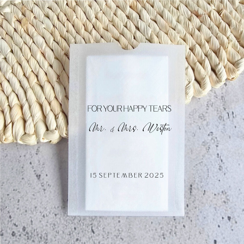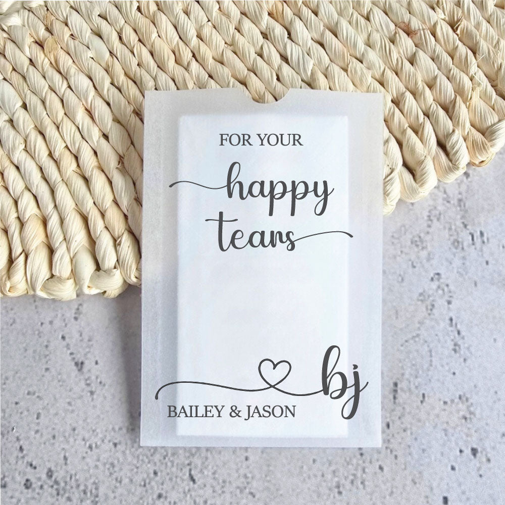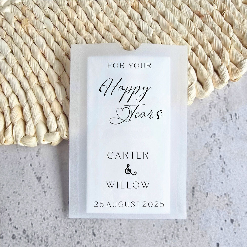 Create a thoughtful touch for your wedding guests with our ‘Happy Tears’ tissues in clear translucent envelope packs. Perfect for capturing emotional moments during your ceremony, these single-use tissues are beautifully packaged in a translucent clear envelope, adding a sophisticated touch to your special day.