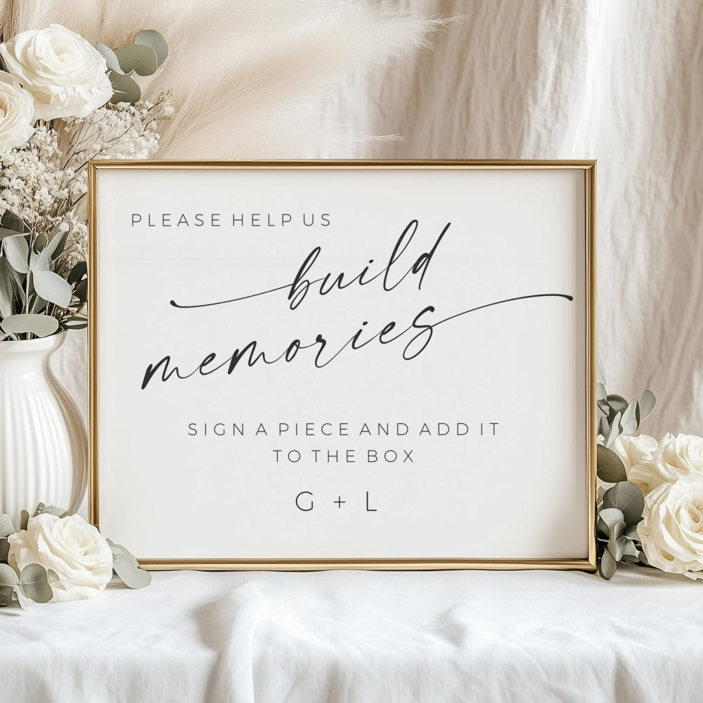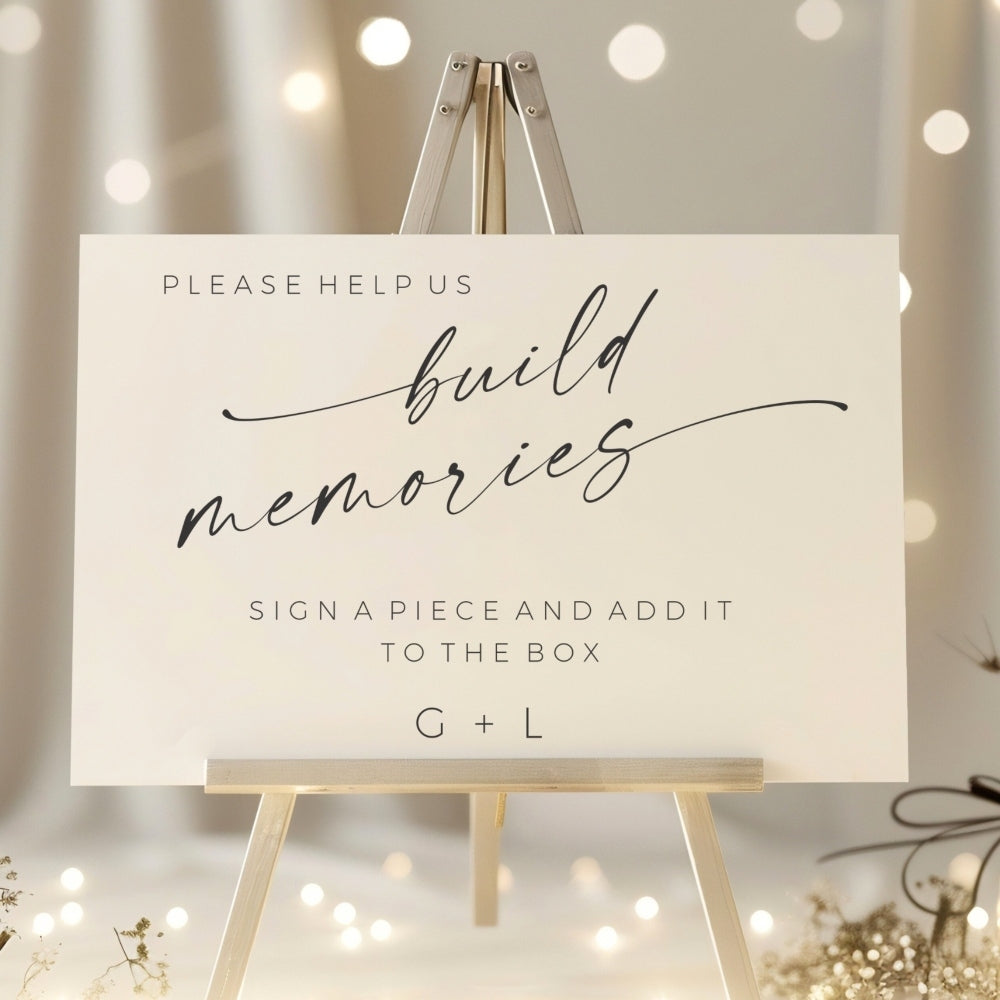 Invite your loved ones to share their wishes and memories with this elegant 'Build Memories' guestbook dropbox wedding sign. Designed in our Minimalist stationery collection modern style.