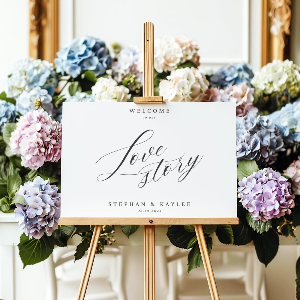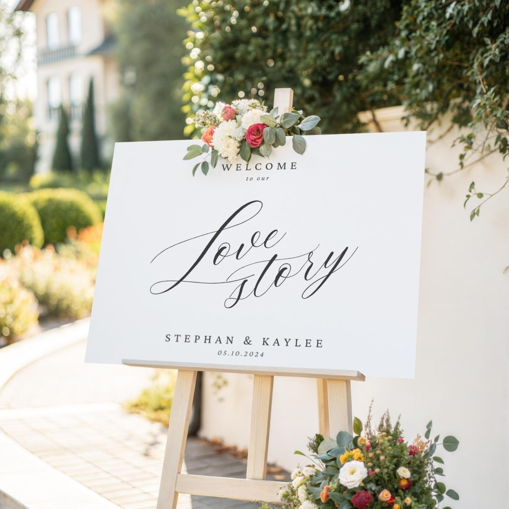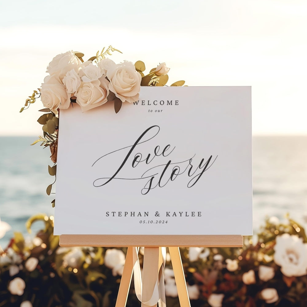 Add to your event décor with a custom Minimalist Love Story Welcome Sign!