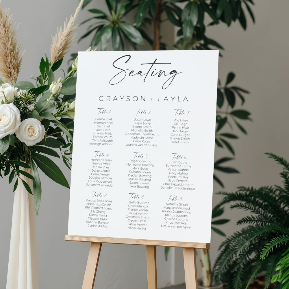 Organize your wedding or event with a custom seating chart in our Minimalist Design Style. Perfect for large gatherings, this seating chart ensures your guests find their seats with ease. Fully customizable and printed on premium material for a polished finish.
