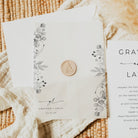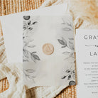 Printed in beautiful full colour, the vellum features delicate floral artwork that gently shows your invitation through the frosted finish - perfect for romantic, modern, botanical, or luxury-themed weddings. The gatefold design closes neatly in the centre, sealed with a hand-pressed wax seal for a refined, keepsake finish.