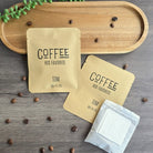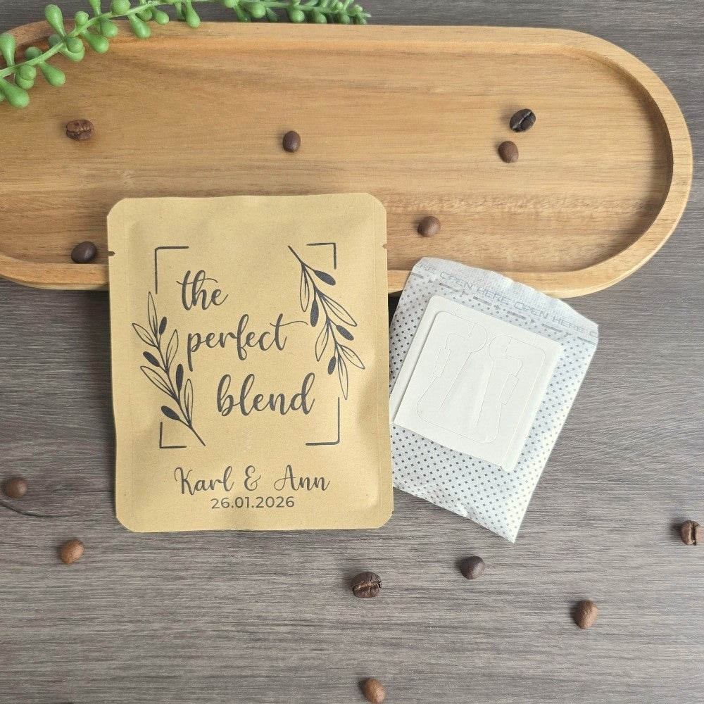 Each set includes a premium single-serve pour-over coffee dripper kit paired with a personalised coffee bag printed with your names, wedding date, or event details. The ground coffee sachet contains medium-roast South African coffee known for its smooth flavour and balanced aroma. The kraft-look pouch features minimalist botanical artwork that enhances the natural, eco-inspired aesthetic of your celebration.