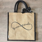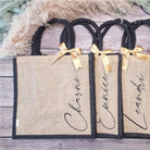 These high-quality jute shopping bags with durable laminated black jute cotton webbing rope in handles are the perfect reusable eco-friendly gift bags.