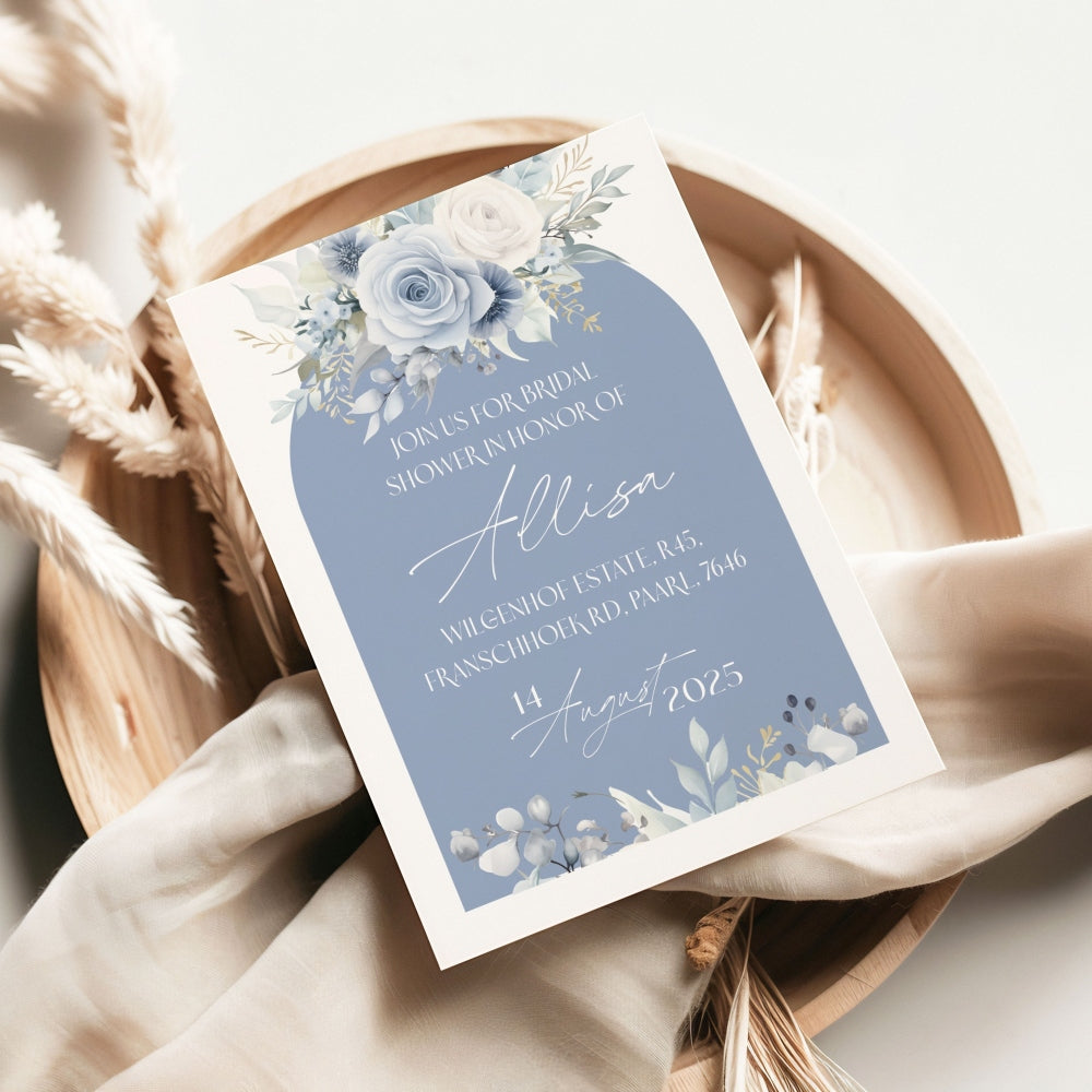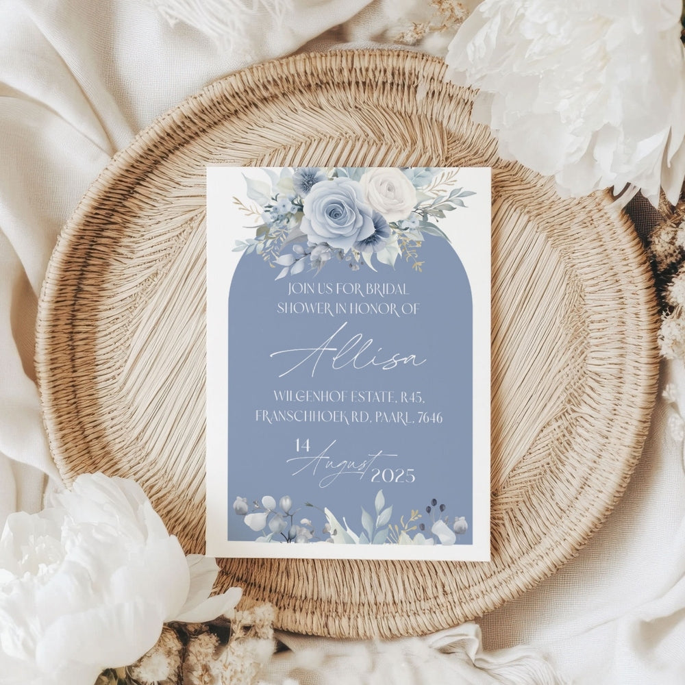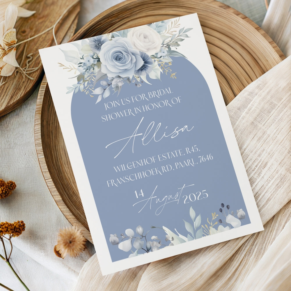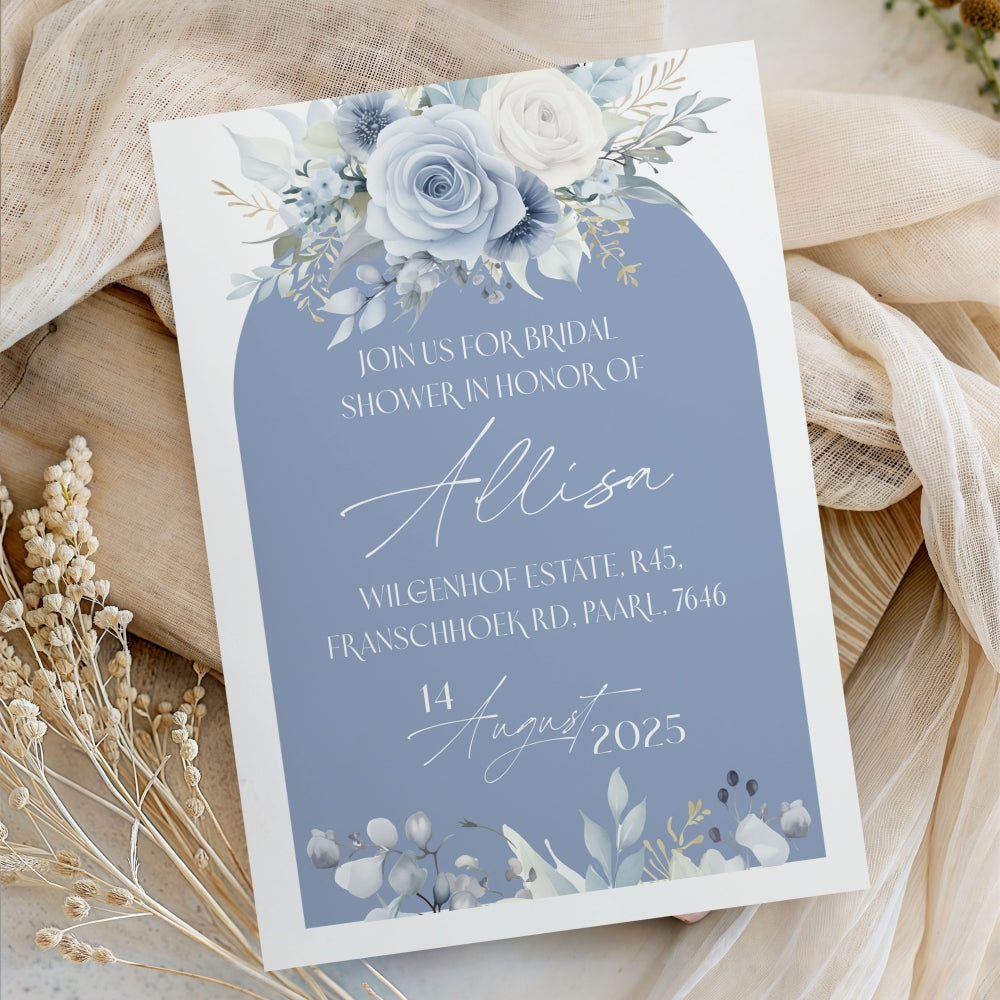 Introducing our Serene Blues Bridal Shower Invitation – a perfect blend of nature-inspired beauty and modern convenience! This stunning design features soft blues, delicate flowers land a subtle green accents, bringing a refreshing and timeless aesthetic to your special event.