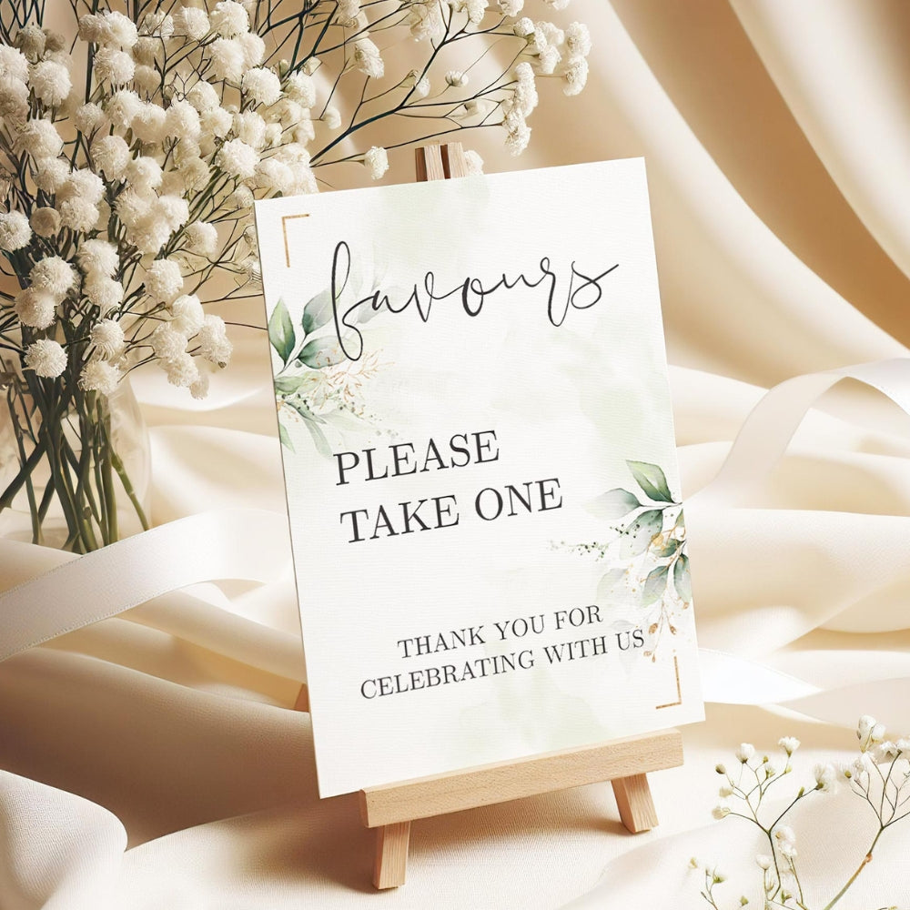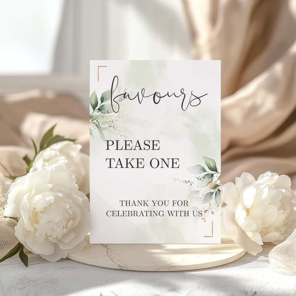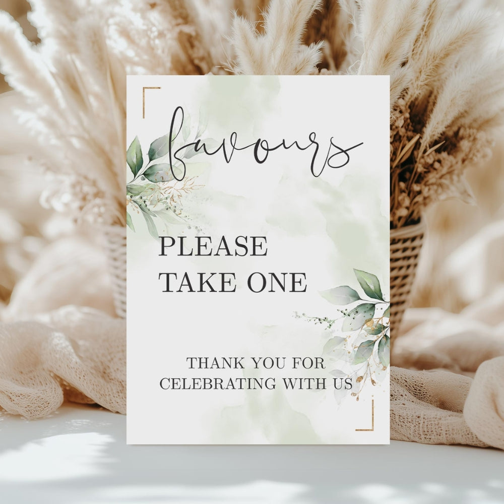 Favours: Please Take One sign from our Elegant Green Botanical stationery collection. Featuring elegant green and gold floral accents paired with modern calligraphy, this sign adds a chic finishing touch to your wedding décor.