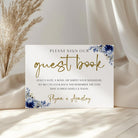 Invite your loved ones to share their wishes and memories with this elegant 'Please Sign Our Guest Book' wedding sign. Designed in our Midnight Blooms stationery collection, this piece features rich navy floral accents, gold accents, and gold lettering that blends timeless romance with modern style.