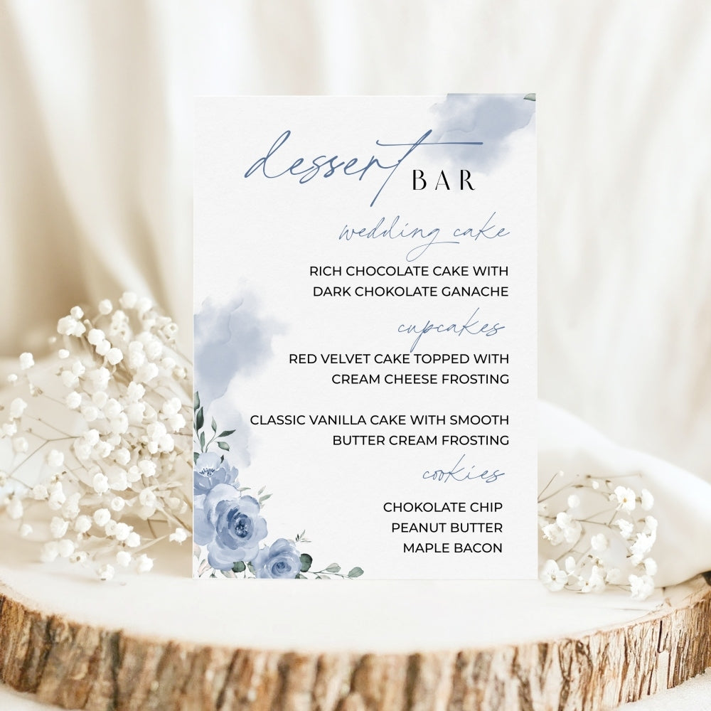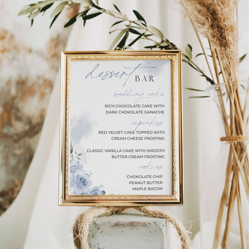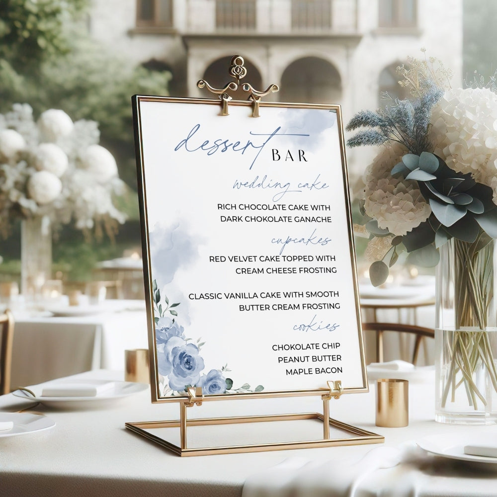 Set the tone for your celebration with our luxury printed dessert bar menu - a stylish and practical way to display your dessert selection. Designed in our Serene Blue Collection, these menus blend seamlessly with a modern and romantic theme.
