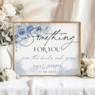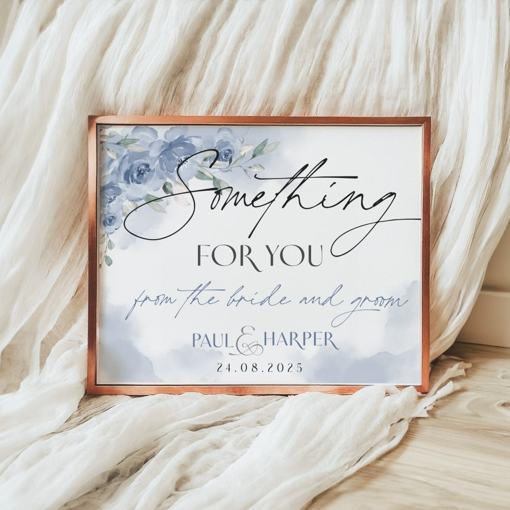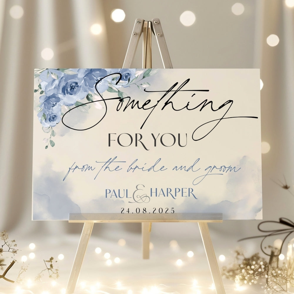 This Favour sign from our Serene Blues stationery collection reads, 'Something for you from the bride and groom'