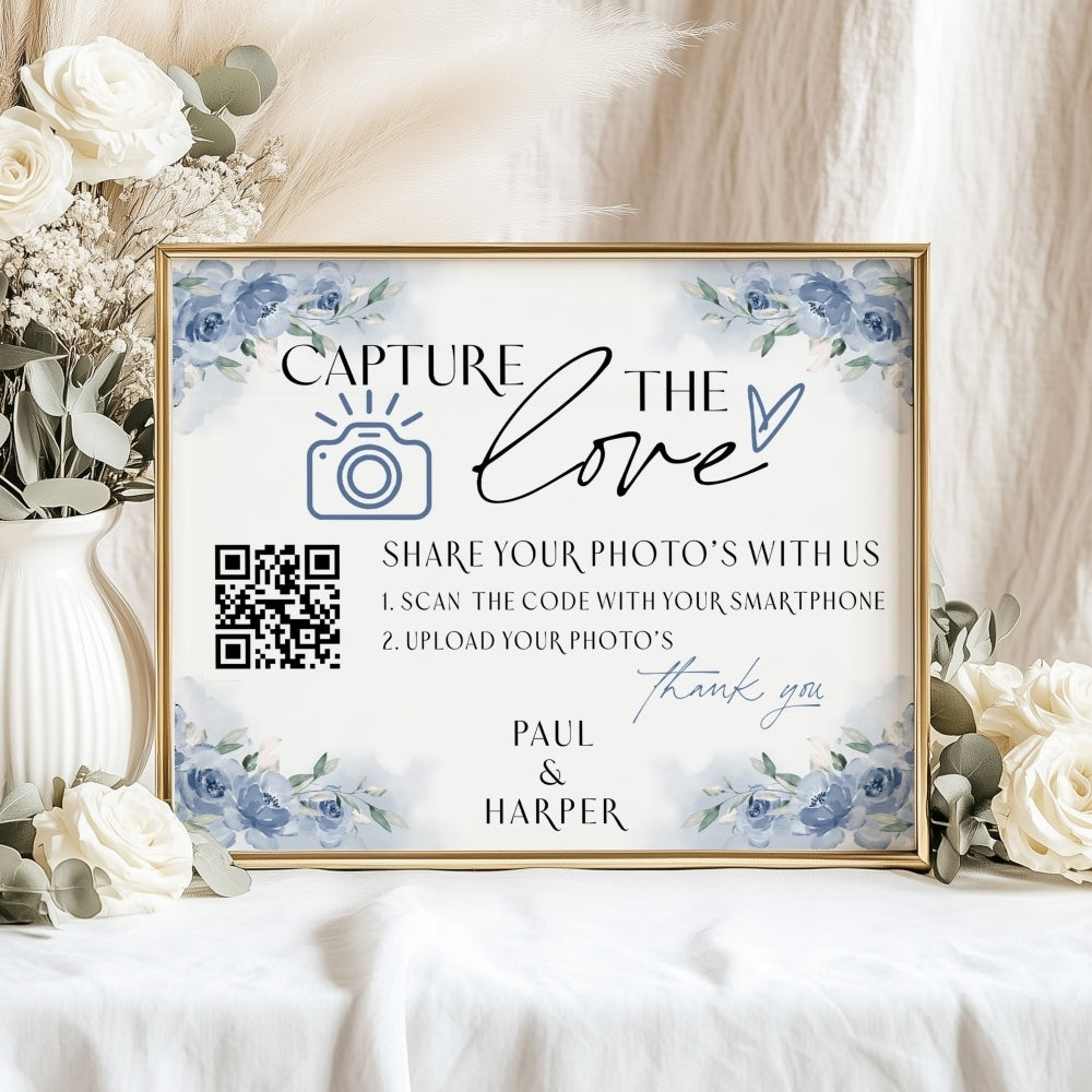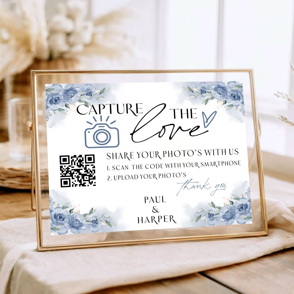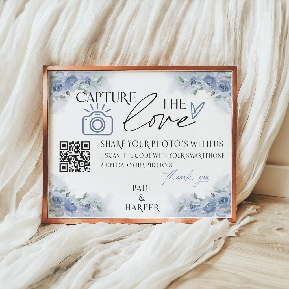 Beautifully crafted with our Serene Blues design, this capture the Love Sign asks guests to share the photos they capture on their cameras and cell phones, allowing you to see your special day from everyone's perspective.