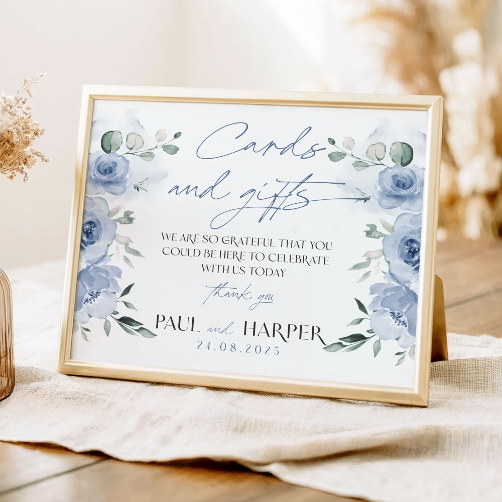 Designed in our Serene Blues stationery collection set, this wedding sign welcomes guests to leave their heartfelt cards and gifts in this designated area. The sign reads, 'We are so grateful that you could be here to celebrate with us today!'