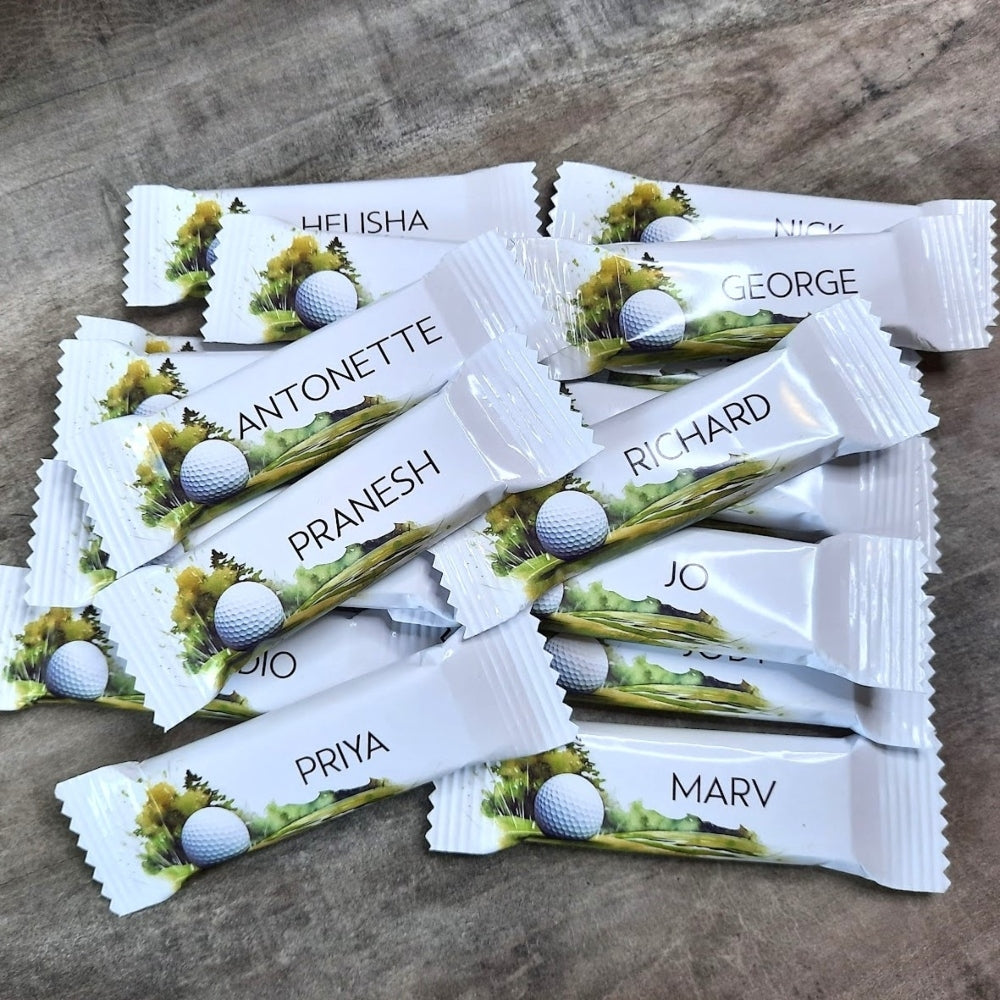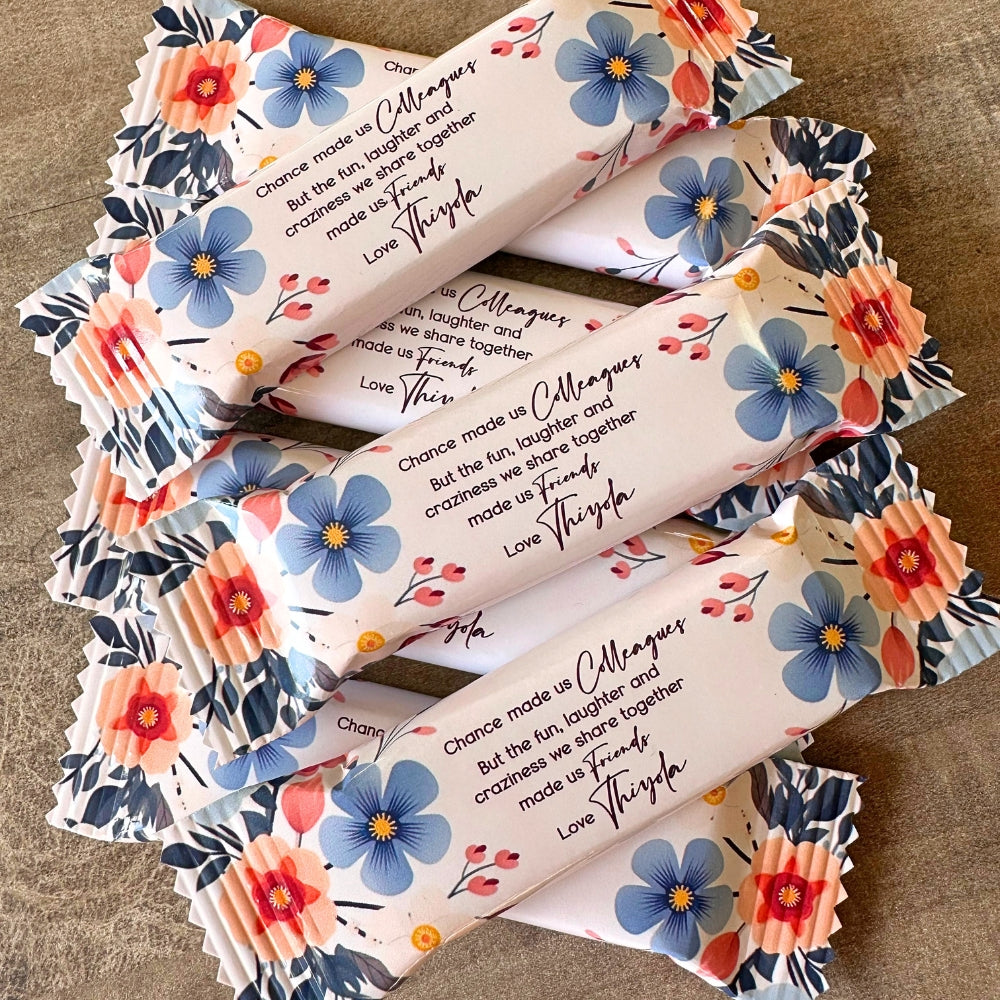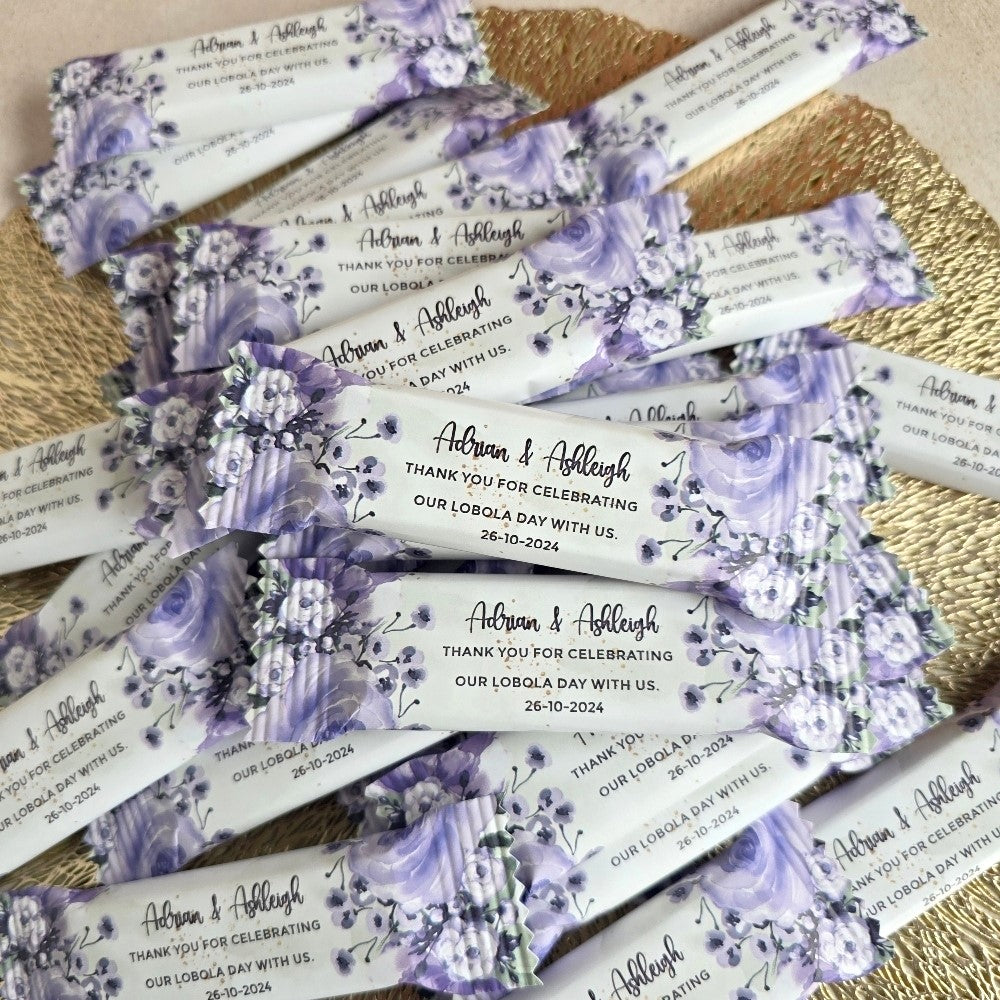 Celebrate your special day with our beautifully personalized wrapped chocolates. These elegant kit-kat treats are perfect for weddings, engagements, or any memorable occasion. Each chocolate bar is carefully wrapped in high-quality paper, featuring custom designs that match your event's theme. With your names and date printed on the wrapper, these chocolates make a delightful keepsake for your guests. Not only are they a sweet treat, but they also add a personal touch to your event's décor. Perfect for thank-you gifts, wedding favours, or as part of a dessert table.