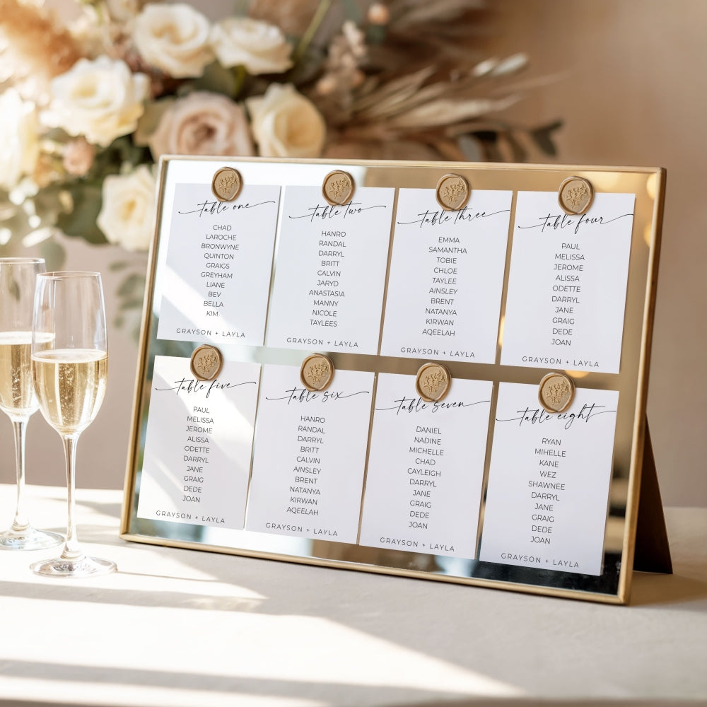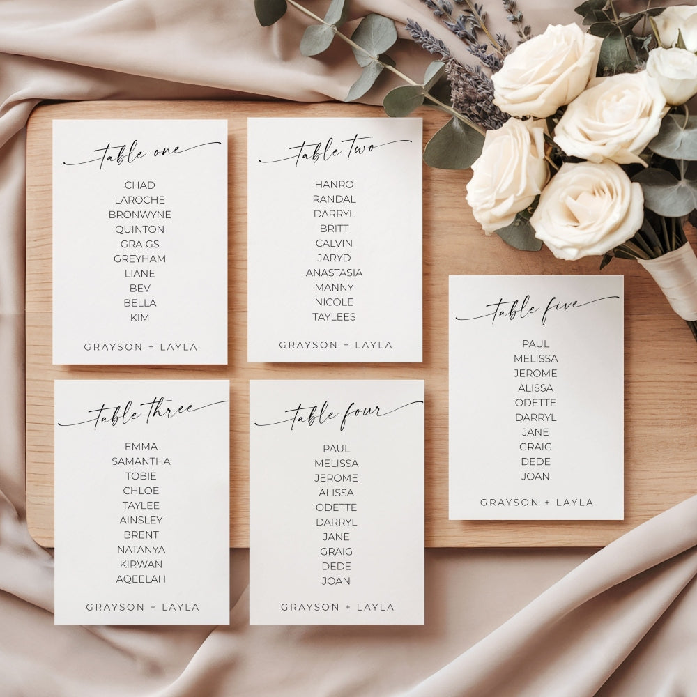 Make your wedding or event stylish and organized with custom printed seating cards. Perfect for large gatherings, these cards can be used to build your own seating chart and ensures your guests find their seats with ease. Fully customizable and printed on premium material for a polished finish.