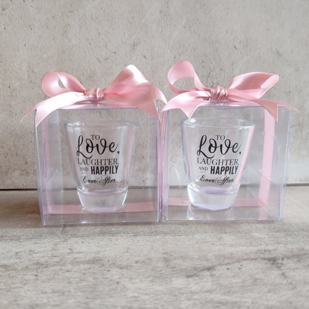 These 25ml shot glasses read 'To Love, laughter and happily ever after' which is printed directly onto the glass.