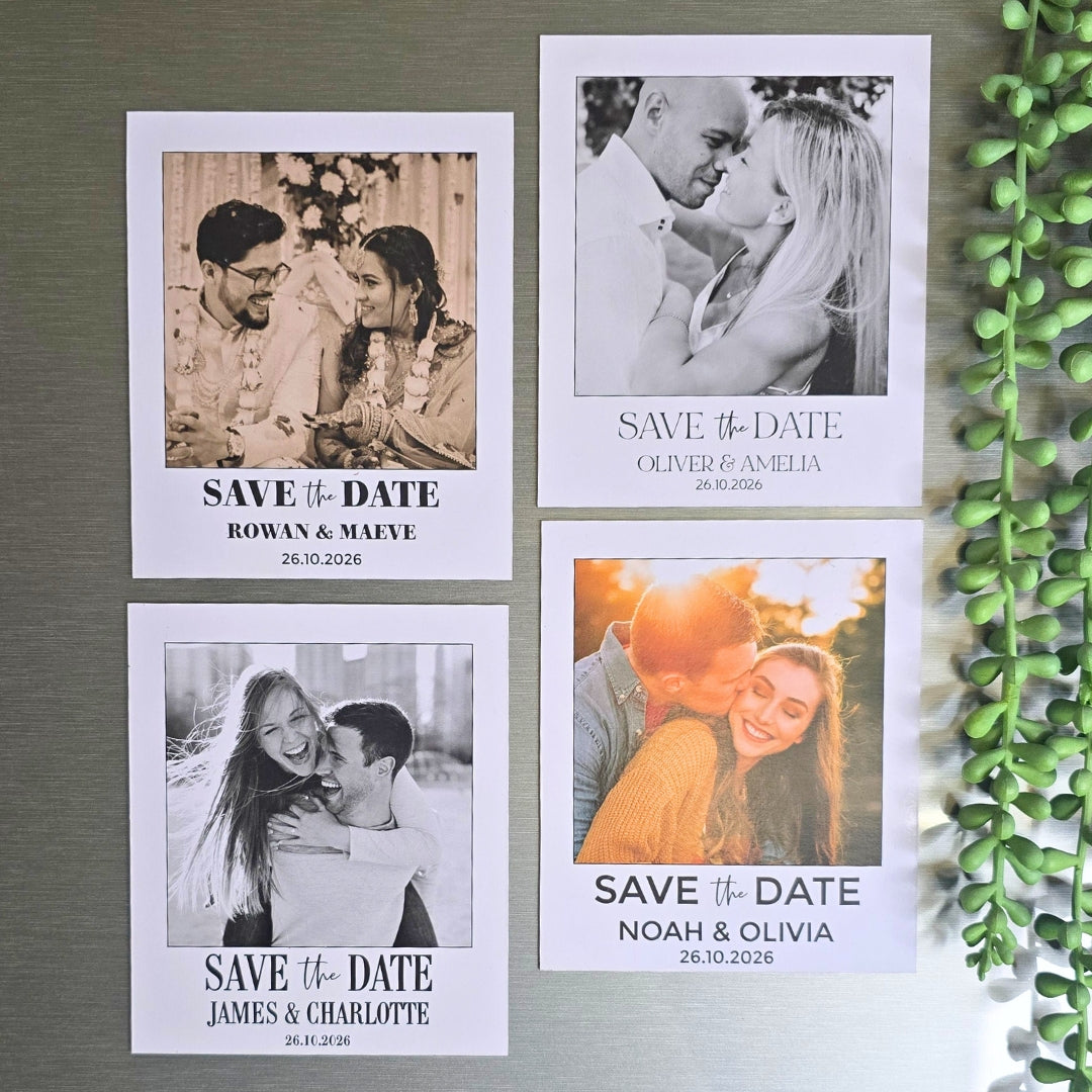 Announce your big day in style with our Polaroid-Style Save the Date Magnets. A unique and memorable way to ensure your guests never forget your wedding date! Designed to look like a classic Polaroid photo, these personalised magnets combine nostalgia with modern elegance, making them the perfect keepsake for your friends and family.