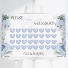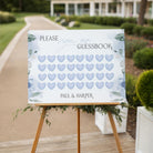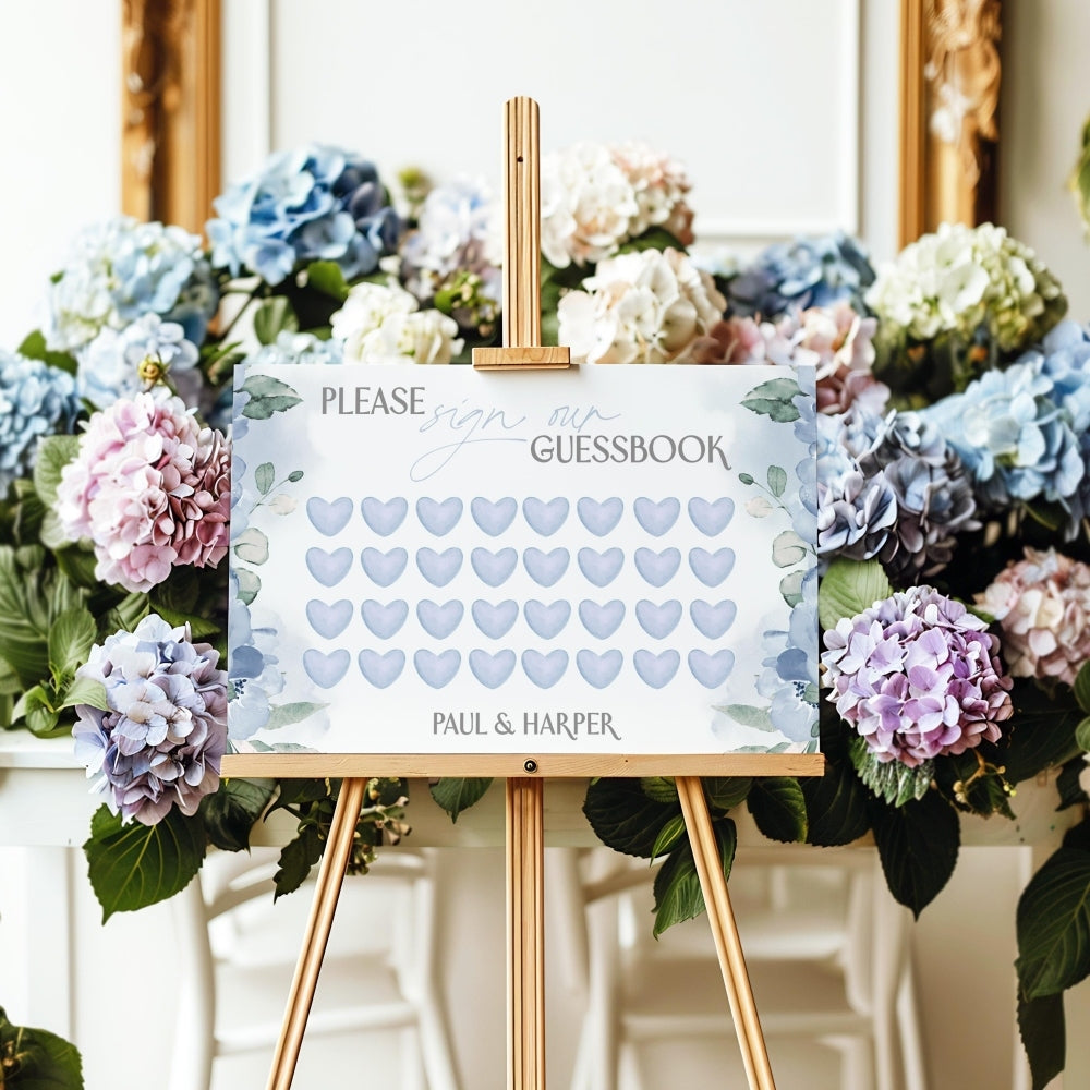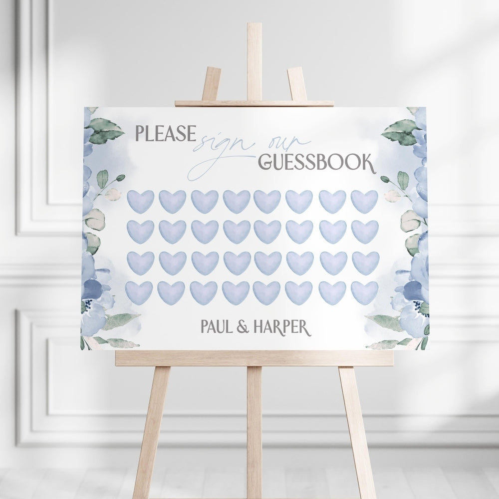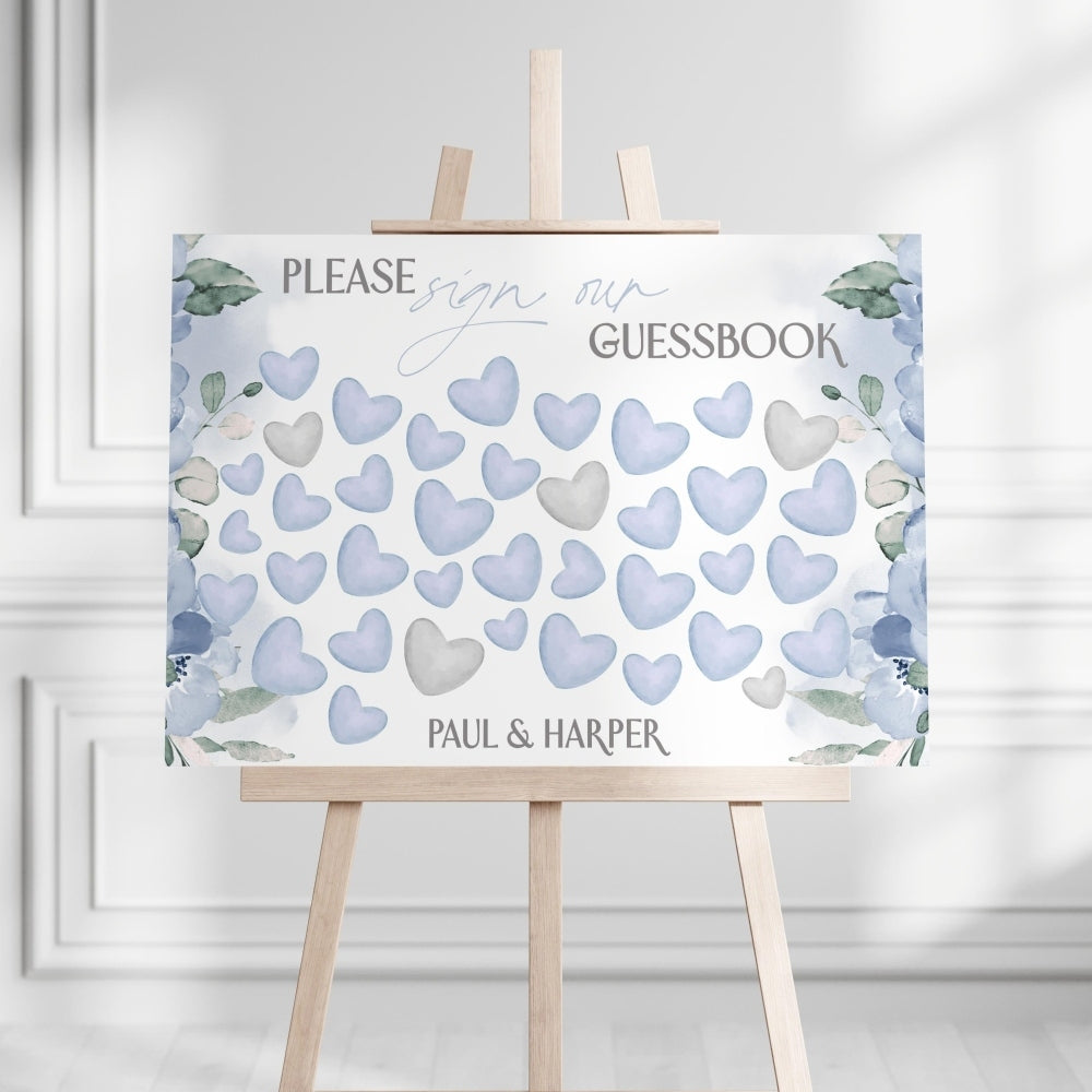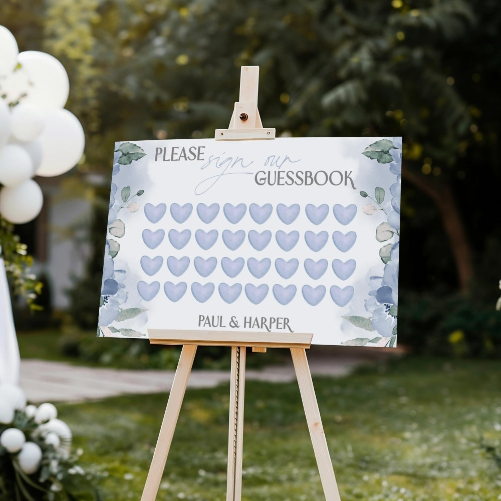 Featuring soft watercolour blue florals and delicate heart icons, this design invites guests to sign, write a short message, or add their initials inside each heart - creating a timeless artwork you’ll treasure long after the celebration ends.