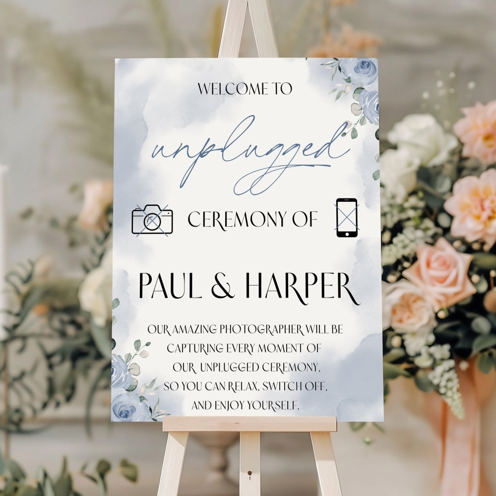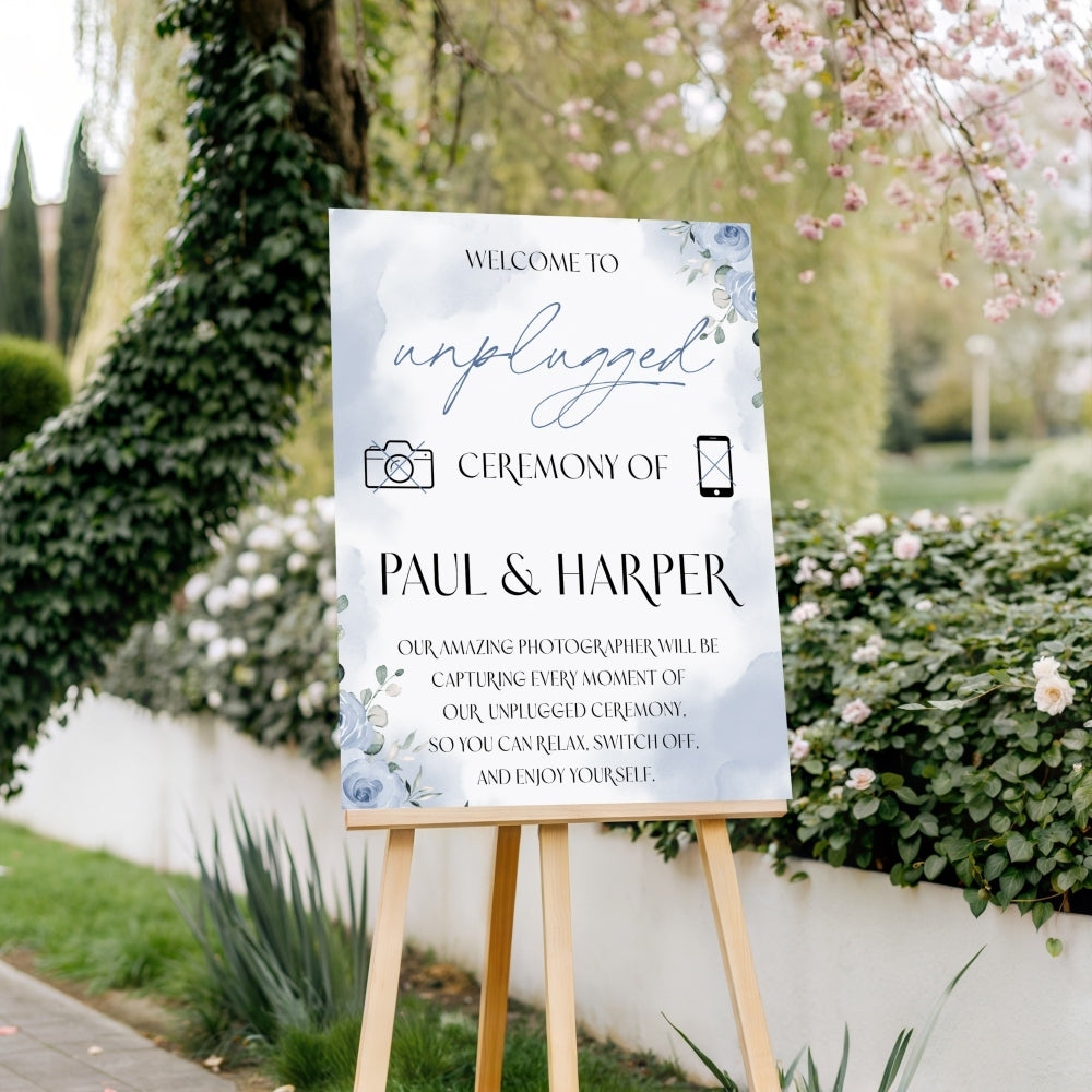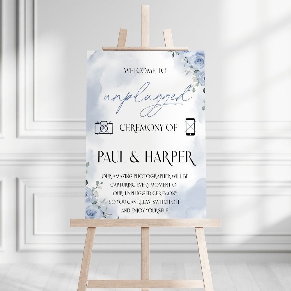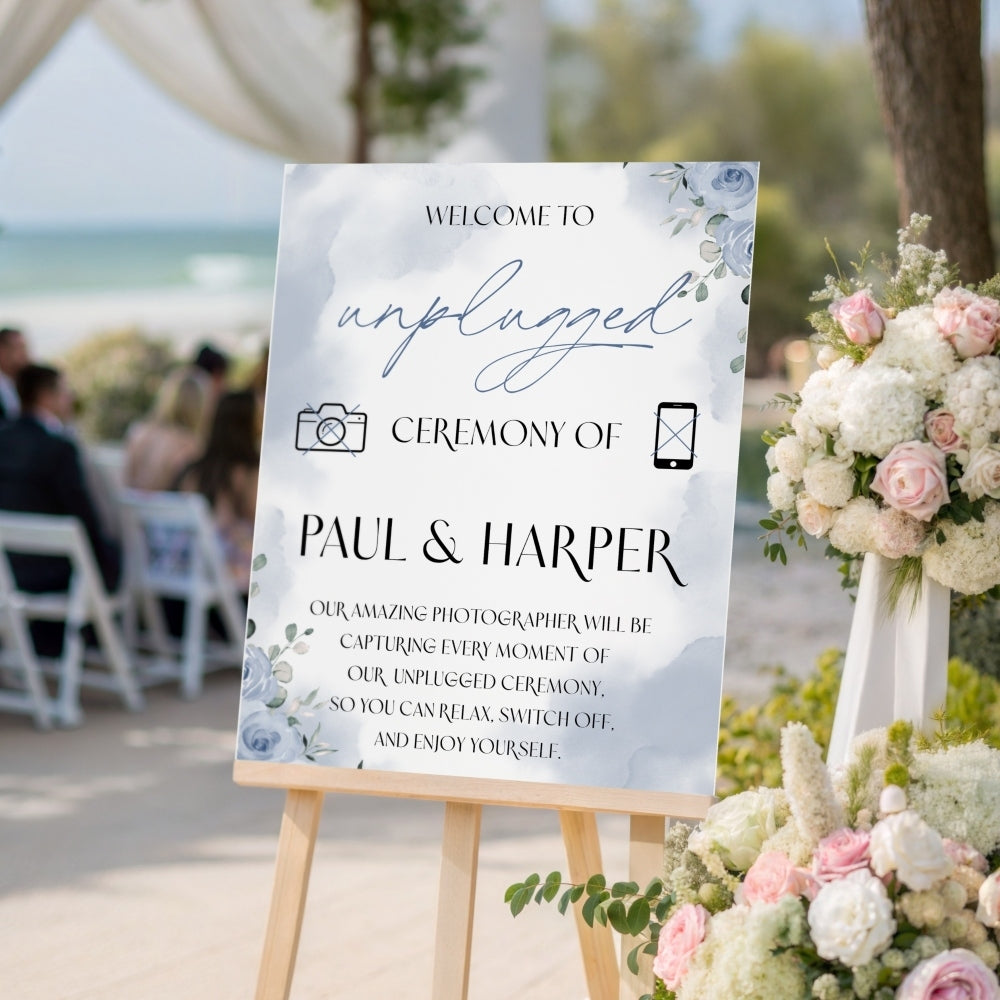 This extra large A1 Unplugged Ceremony Sign in Serene Blues Design can be customised. Gently remind guests to switch off their cameras and cell phones, allowing everyone to fully immerse themselves in your special moment.