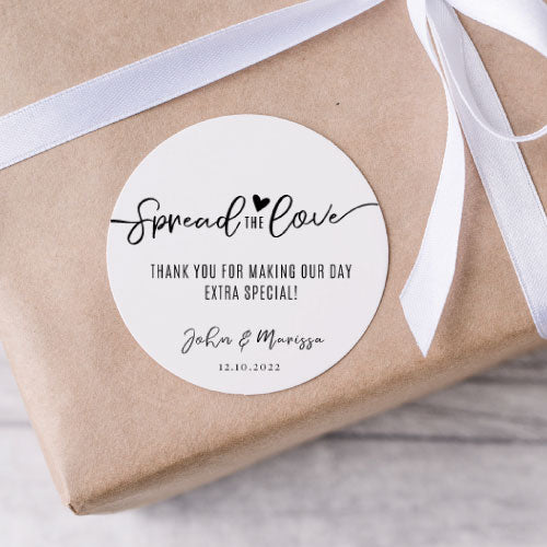 This favour tag reads "Spread the Love, Thank you for making our day extra special" with the couples names and their special date.