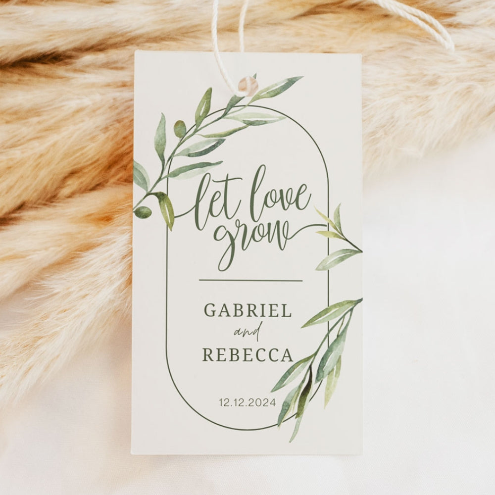Personalize your gifts by adding a personalised thank you tag with an Olive branch design that reads Let Love Grow