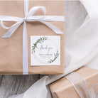 Personalize it and make your gifts extra special by adding a personalized round thank you tag. This one comes with a geometric frame in gold gold that is surrounded with green eucalyptus leaves.