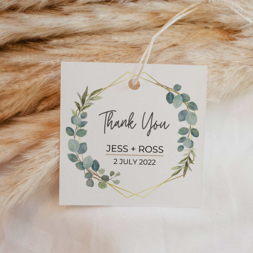 Personalize it and make your gifts extra special by adding a personalized round thank you tag. This one comes with a geometric frame in gold that is surrounded with green eucalyptus and leaves.